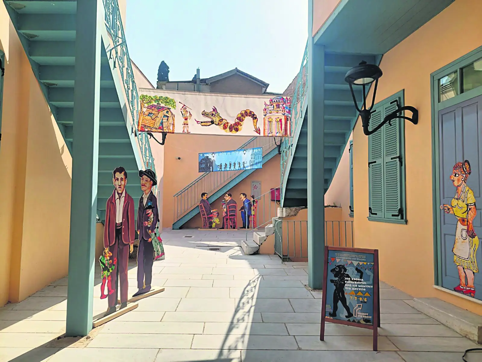 «Μεταφορά στον χρόνο, ζωντάνεμα της μνήμης!», περιγράφουν στον «Ε.Τ.» η διευθύντρια του Μουσείου Νεότερου Ελληνικού Πολιτισμού, Ελενα Μελίδη, και η επιμελήτρια της έκθεσης, Νίκη Δάφνη, η οποία υπογράφει τον μουσειολογικό σχεδιασμό μαζί με τη Μαρίνα Καψαμπέλη, μέλος του Πανελλήνιου Σωματείου Θεάτρου Σκιών. Στο βάθος της αυλής η είσοδος της έκθεσης. Στον προθάλαμο, σε μικρό σκοτεινό δωμάτιο, παρουσιάζονται, μέσω προβολής, τα πρώτα βήματα του θεάματος στον ελληνικό χώρο. Στην αίθουσα που ακολουθεί ο πρωταγωνιστής του ελληνικού θεάτρου σκιών, ο Καραγκιόζης, καλωσορίζει τους επισκέπτες, ενώ ο πάγκος του καραγκιοζοπαίκτη με όλα τα υλικά, εργαλεία και σύνεργα ζωγραφικής του, σε συνδυασμό με ψηφιακό υλικό, τους μυεί στην αθέατη πλευρά της δημιουργίας και αναδεικνύει την πολύπλευρη εργασία και την πολυτάλαντη φύση του καραγκιοζοπαίκτη. Ακολούθως, ο θίασος με τις βασικές φιγούρες του θεάτρου σκιών συστήνεται και στο βάθος εντυπωσιάζει ο μπερντές με τον Μέγα Αλέξανδρο να πολεμάει το φίδι. Ενα από τα κολλητήρια σε καθοδηγεί στο δεύτερο επίπεδο της έκθεσης!