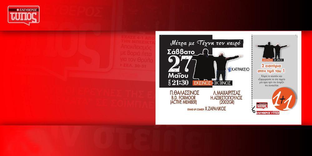 Το EleftherosTypos.gr και ο Ελεύθερος Τύπος της Κυριακής έχουν μία μοναδική προσφορά. Δύο εισιτήρια στην τιμή του ενός για την συναυλία που «ανοίγει» το συναυλιακό καλοκαίρι!