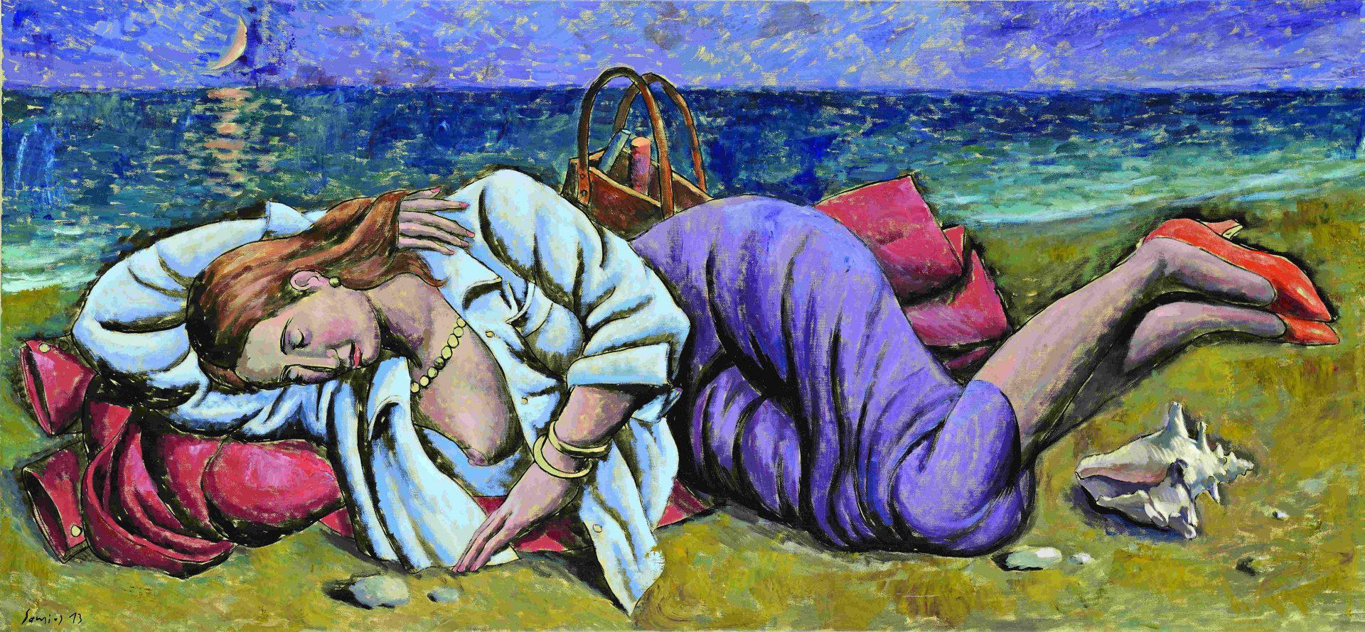 Ωστόσο αυτή τη φορά ο ζωγράφος μας αποκαλύπτει και μέρος του ατελιέ του, καθώς δεν λείπουν τα εργαλεία που χρησιμοποιεί, τα μοντέλα, τα έργα που δεν έχουν ακόμα πάρει την τελική τους μορφή και είναι πάνω στο καβαλέτο. Η ανθρώπινη παρουσία αυτή καθ’ αυτή δεν θα μπορούσε να λείπει από μια ζωγραφική που υμνεί τη γυναίκα και τον έρωτα με την πρώτη ευκαιρία.