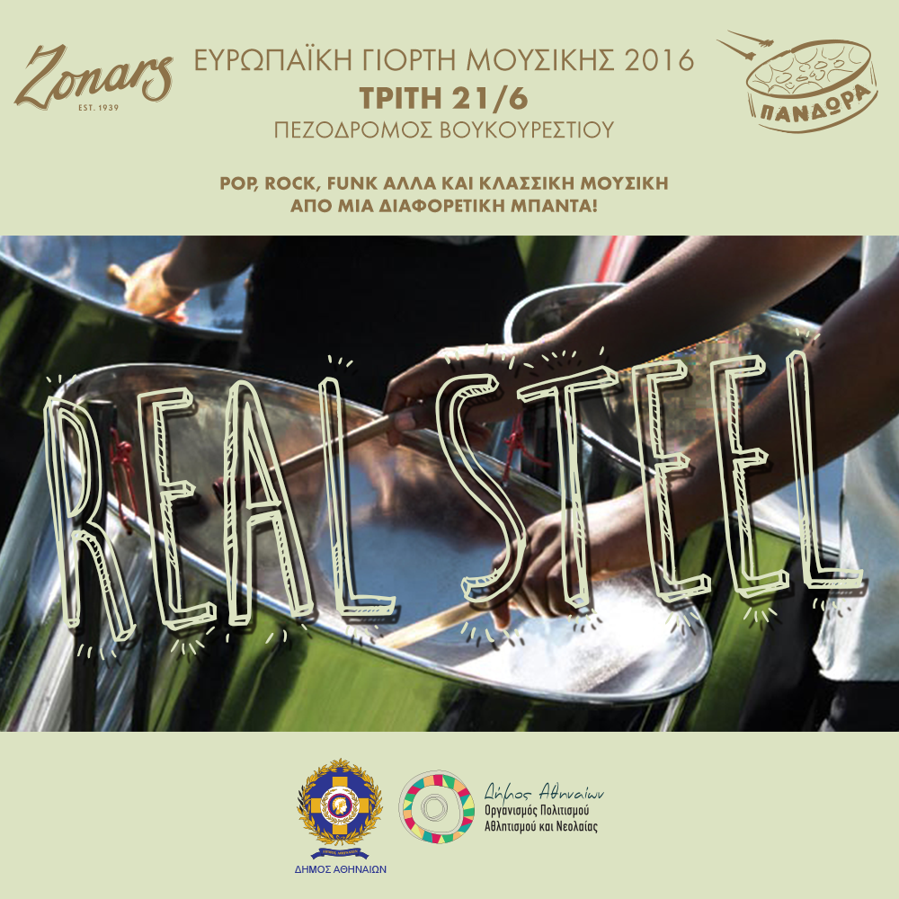 Στο πλαίσιο των πολιτιστικών παρεμβάσεων στην καρδιά της Αθήνας, το ιστορικό Zonars φιλοξενεί δύο μουσικά event στον πεζόδρομο της Βουκουρεστίου, την Τρίτη 21 και την Τετάρτη 22 Ιουνίου, στις 7.00 μ.μ.. με αφορμή την ευρωπαϊκή γιορτή της Μουσικής σε συνδιοργάνωση με τον Οργανισμό Πολιτισμού, Αθλητισμού και Νεολαίας του Δήμου Αθηναίων και το Πολιτιστικό μη κερδοσκοπικό Σωματείο Πανδώρα. Καλεσμένοι, οι εκπληκτικοί μουσικοί της REAL STEEL BAND που έρχονται από το Λονδίνο αποκλειστικά γι΄αυτή τη γιορτή της μουσικής. Μαζί τους, οι υπέροχοι μαθητές της ΠΑΝΔΩΡΑΣ, υπόσχονται να δώσουν τον καλύτερο εαυτό τους!