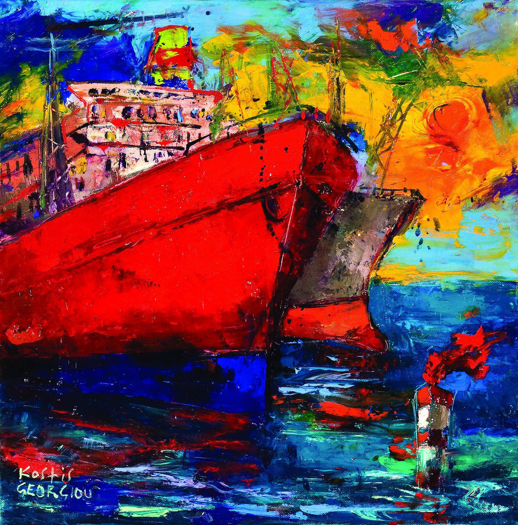 Έργα μεγάλων και μικρότερων διαστάσεων τα οποία μας προσκαλούν στο εικαστικό, αναγνωρίσιμο σύμπαν του Κωστή Γεωργίου. Έντονοι χρωματισμοί, με τα μπλε και κόκκινα να κυριαρχούν, φιγούρες άλλοτε οικείες και άλλοτε επίτηδες γκροτέσκες και αλληγορικές μέσα από μια εντελώς προσωπική, σουρεαλιστική διάθεση. Οι ταύροι του κάνουν αισθητή την παρουσία τους, αποπνέοντας τη ζωοποιό ενέργεια και δυναμική του καλλιτέχνη. Δεν λείπουν και πιο καλοκαιρινά θέματα, πλοία, νεκρές φύσεις, φρούτα, κολυμβητές και θάλασσες. Η διάθεση στους καμβάδες του Κωστή Γεωργίου είναι εκρηκτική. Αποτέλεσμα της δυνητικής μάχης του δημιουργού με την έμπνευση του.