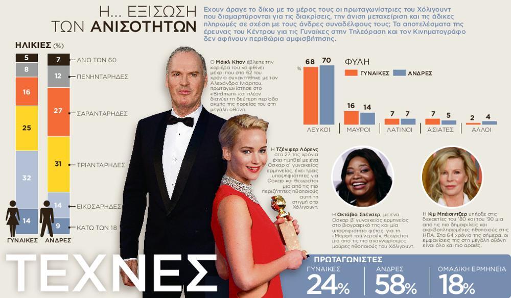 «Είναι δυο φορές πιο πιθανό να δείτε άνδρες πρωταγωνιστές όταν πηγαίνετε στους κινηματογράφους για να δείτε ταινίες», διαπιστώνει η έρευνα. Ενα ακόμη ενδιαφέρον στοιχείο είναι ότι όταν άνδρες υπογράφουν τη σκηνοθεσία και το σενάριο μιας ταινίας το ποσοστό των γυναικών πρωταγωνιστριών πέφτει στο 20%. Αντιθέτως, όταν γυναίκες σκηνοθετούν και γράφουν τα σενάρια, γυναίκες θα είναι εκείνες που θα αναλάβουν τους πρωταγωνιστικούς ρόλους κατά 45%. Σημειώστε επίσης ότι αν μια παραγωγή προέρχεται από μεγάλο στούντιο, το ποσοστό των γυναικών που πρωταγωνιστούν φτάνει το 35%, ενώ, όταν μια παραγωγή είναι ανεξάρτητη, το ποσοστό ανεβαίνει στο 65%. Τα αντίστοιχα νούμερα για τους άνδρες είναι 54% συμμετοχή στις παραγωγές των μεγάλων στούντιο και 46% στις ανεξάρτητες παραγωγές.
