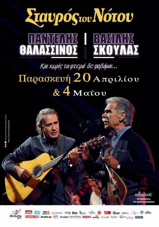 Τα Σμυρνέϊκα τραγούδια περπατούν και πετούν πλάι στον Ήλιο Θεό, οι Γωνιές παίρνουν φωθιά και σβήνουν σε Καράβια χιώτικα, η Δροσοσταλίδα γίνεται Εισιτήριο στην τσέπη μας, το Ανάθεμα σε ακούγεται εως της Γραμβούσας τ’ακρωτήρι, τα Μαύρα μας μάτια Κρατούν για το τέλος το πιο μεγάλο μίσος, του Παραδείσου η Λεμονιά ενώνεται με το γλυκό Μανταρίνι, ενώ το Βαθύ ποτάμι του έρωτα φθάνει εως τις Χανιώτικες Μαδάρες, τα Λασιθιώτικα βουνά και τις κορφές του Ψηλορείτη… Ο Βασίλης Σκουλάς και ο Παντελής Θαλασσινός, μας ταξιδεύουν στα πέλαγα των πιο γνωστών τους τραγουδιών, επιφυλάσσοντας μας παράλληλα πολλές εκπλήξεις μέσα από την κοινή σκηνική τους παρουσία, με την ανάγκη κι επιθυμία να μας αφήσουν πολλά “γλυκά” σημάδια της σύμπραξης τους, στις καρδιές και τις σκέψεις μας…