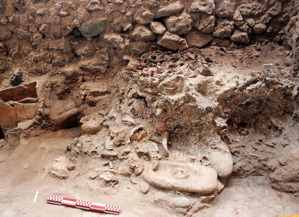 – «Στον Χώρο 1 αποκαλύφθηκαν τέσσερα νευρωτά αγγεία, που είχαν μερικώς αποκαλυφθεί σε προηγούμενες ανασκαφικές περιόδους, καθώς και μπρούτζινα αντικείμενα, όπως δύο μεγάλοι διπλοί πελέκεις από πολύ λεπτό μπρούντζινο έλασμα αλλά και άλλοι μικρογραφικοί πυρήνες κεράτων, μικροσκοπικές ψήφοι ενός ή περισσοτέρων περιδεραίων.