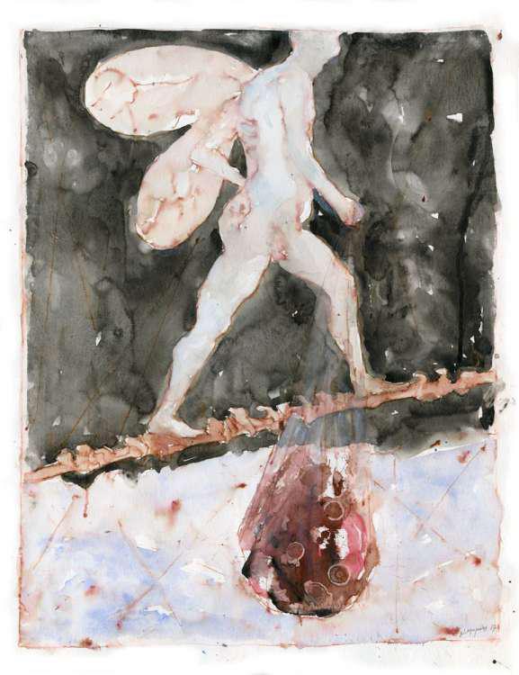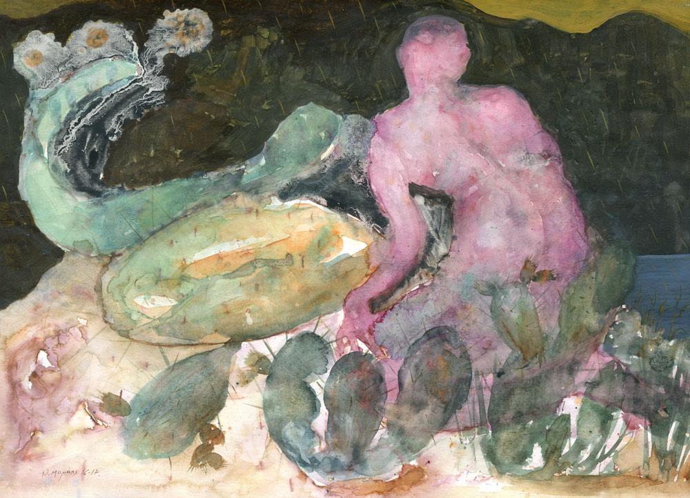 Κι ενώ «ακτινογραφεί» σάρκινα τοπία μιας ανδρόγυνης μορφής, έργα σπλαχνικά που γεννιούνται μέσα στον ζωγραφικό σάκο, μας δίνει σαν φυσική εξέλιξη, μια σειρά από μεγάλα τοπία, όπου «πλάθει» κυριολεκτικά τα υλικά του: ακρυλικά, λάδι, αυγοτέμπερα, όλα σε μια μεικτή τεχνική. Ένα πανδαιμόνιο που παρέχει στο θεατή ποικίλες όψεις ανάλογα με τον φωτισμό του έργου. Εδώ, περισσότερο ίσως από τις υδατογραφίες, ενδιαφέρει τον ζωγράφο η χρωματική του ύλη, το χρώμα, που γίνεται πρόσχημα και, εν τέλει, στόχος στο τελάρο. Κι είναι φυσικό το τοπίο να του δίνει περισσότερες δυνατότητες στην ανάπτυξη αυτών των επιδιώξεων.