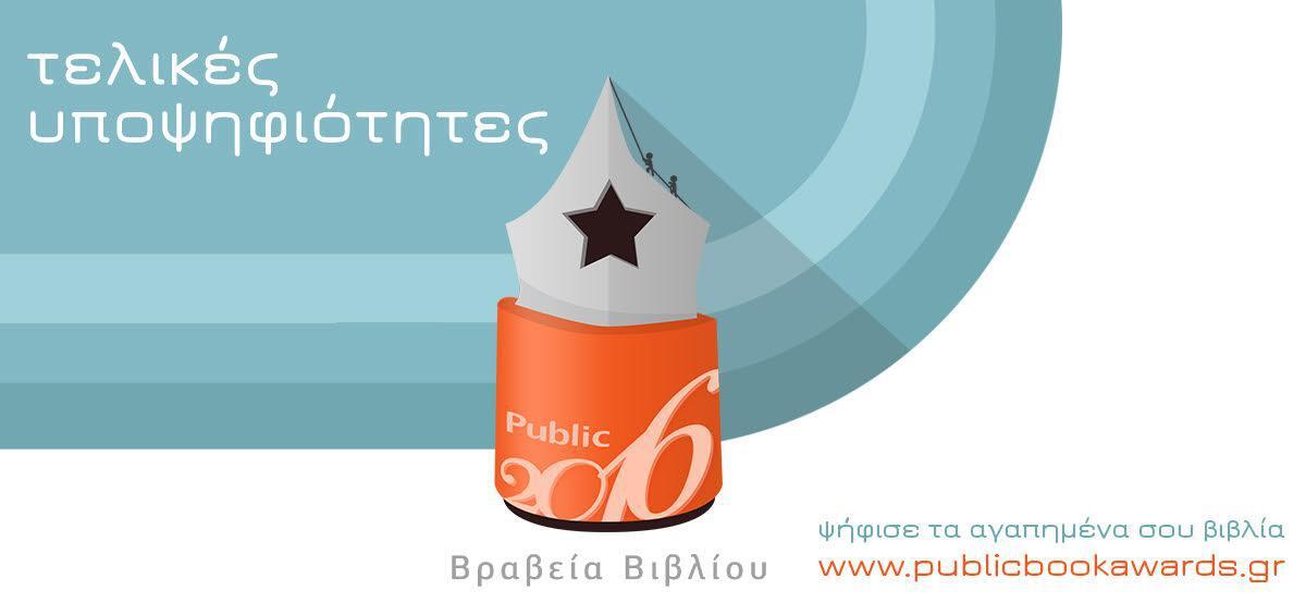 Ψηφίστε τώρα τους μεγάλους νικητές των Βραβείων Βιβλίου Public 2016 από τις βραχείες λίστες που εσείς διαμορφώσατε. Δείτε αναλυτικά τις βραχείες λίστες για το 2016 (τελική δεκάδα υποψήφιων βιβλίων ανά κατηγορία με αλφαβητική σειρά):