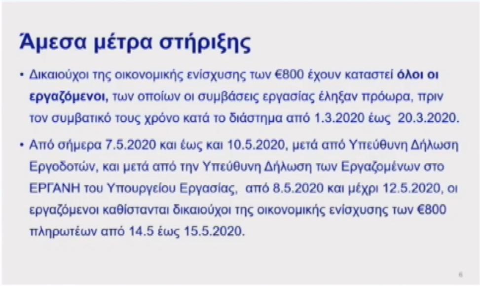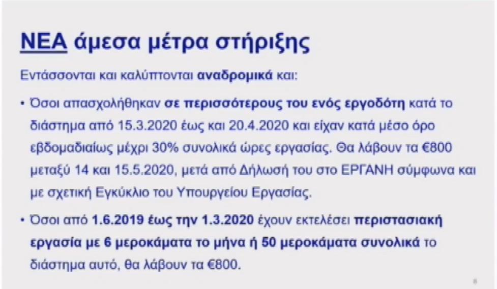 Δικαιούχοι της οικονομικής ενίσχυσης των 800 ευρώ έχουν καταστεί όλοι οι εργαζόμενοι, των οποίων οι συμβάσεις εργασίας έληξαν πρόωρα, πριν τον συμβατικό τους χρόνο κατά το διάστημα από 1η Μαρτίου 2020 έως 20 Μαρτίου 2020.