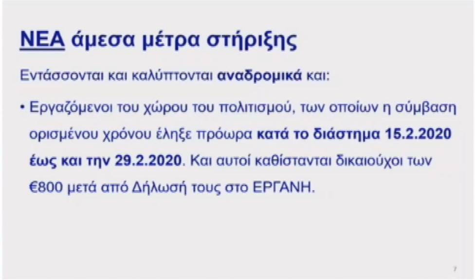 Οι εργαζόμενοι του χώρου του πολιτισμού, των οποίων η σύμβαση ορισμένου χρόνου έληξε πρόωρα κατά το διάστημα 15 Φεβρουαρίου 2020 έως και την 29 Φεβρουαρίου 2020 καθίστανται δικαιούχοι των 800 ευρώ μετά από δήλωσή τους στο σύστημα «Εργάνη».