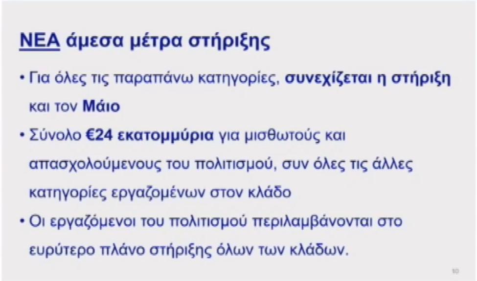 «Ο στόχος μας είναι διπλός από την αρχή, από τον Μάρτιο. Να κρατηθεί ο Πολιτισμός δυνατός, να στηριχθούν δημιουργοί και καλλιτέχνες. Μας ενδιαφέρει η επιδότηση της εργασίας και όχι της ανεργίας. Δεν θέλουμε ένα απολιτιστικό τοπίο στην Ελλάδα εξαιτίας της πανδημίας, δεν θέλουμε ένα απολιτιστικό καλοκαίρι το 2020», προσέθεσε η υπουργός που ως προς τα άμεσα μέτρα στήριξης τόνισε ότι «από 13/5 ως 19/5 θα πάρουν τα 800 ευρώ όσοι έλαβαν το ειδικό εποχικό επίδομα Σεπτεμβρίου-Νοεμβρίου 2019 και δεν είναι δικαιούχοι τακτικής ανεργίας του πρώτου τριμήνου του 2020».