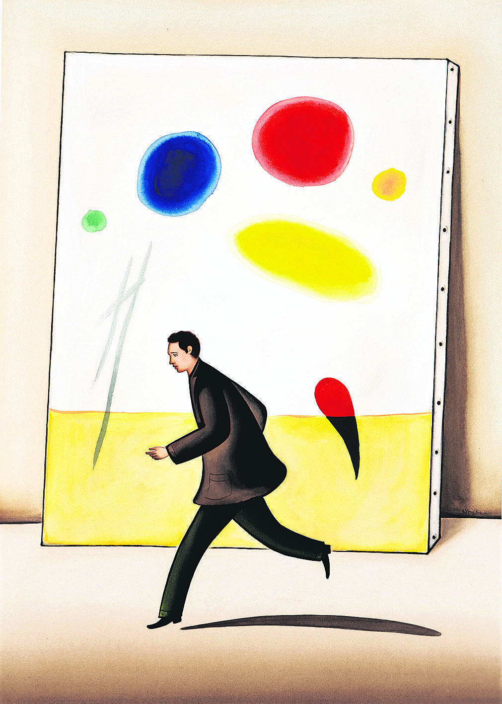 Μου είναι ιδιαίτερα ευχάριστο να ζωγραφίζω με ακουαρέλες, κυρίως γιατί απαιτείται λιγότερος χρόνος για να ολοκληρωθεί ο κάθε πίνακας. Αυτά τα έργα τα κρατούσα για μένα, για να μου θυμίζουν τις διάφορες περιόδους της δουλειάς μου. Μια μέρα τα συγκέντρωσα όλα στην Αθήνα και, ξανακοιτώντας τα, επέλεξα μερικά για να τα δείξω σε αυτήν την έκθεση. Ζωγράφισα επίσης και μερικά καινούργια. Ξέρετε, έχω σημειωμένες σε χαρτάκια πολλές ιδέες για έργα που όταν έρθει η ώρα θα τα μεταφέρω στο τελάρο. Υπήρχαν, λοιπόν, μεταξύ άλλων και ιδέες για πίνακες της προηγούμενης, πολύχρωμης, περιόδου μου, που, αντί να μείνουν στα συρτάρια, αποφάσισα να τις φτιάξω με ακουαρέλες.