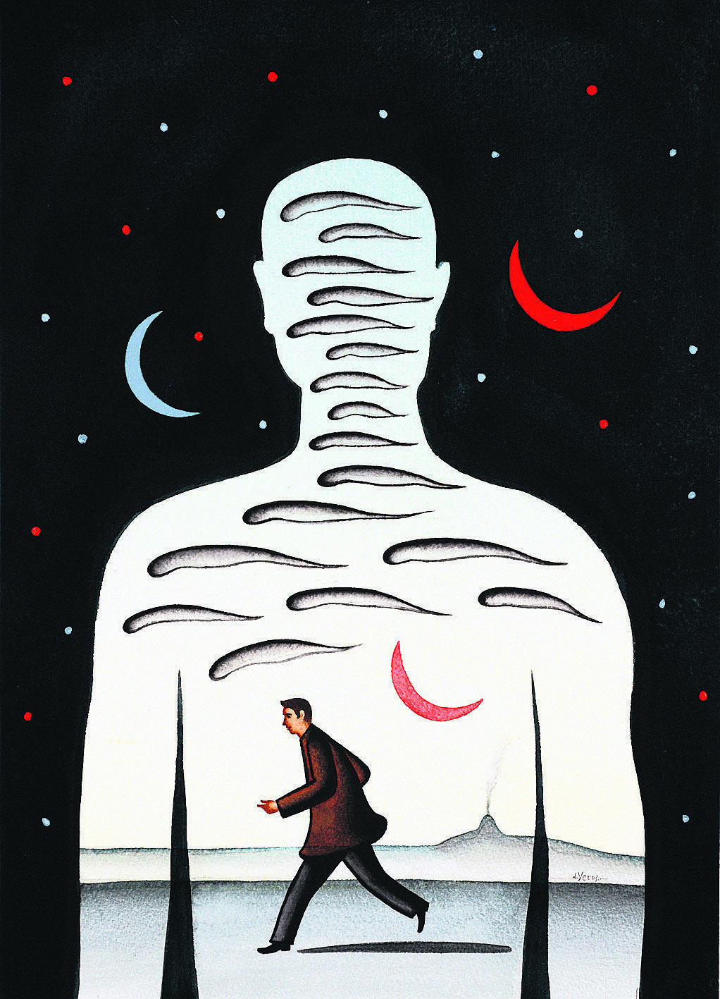 Με αυτήν την έκθεση νομίζω πως ολοκληρώνεται η ζωγραφική περίοδος τριών δεκαετιών και έχει ήδη ανοίξει μία άλλη. Εχω πια απομακρυνθεί από τα πολύχρωμα έργα, που έκανα κυρίως σε καφέ και μπλε αποχρώσεις, και προτιμώ περισσότερο λιτά εκφραστικά μέσα, με κυρίαρχο χρώμα το μαύρο.