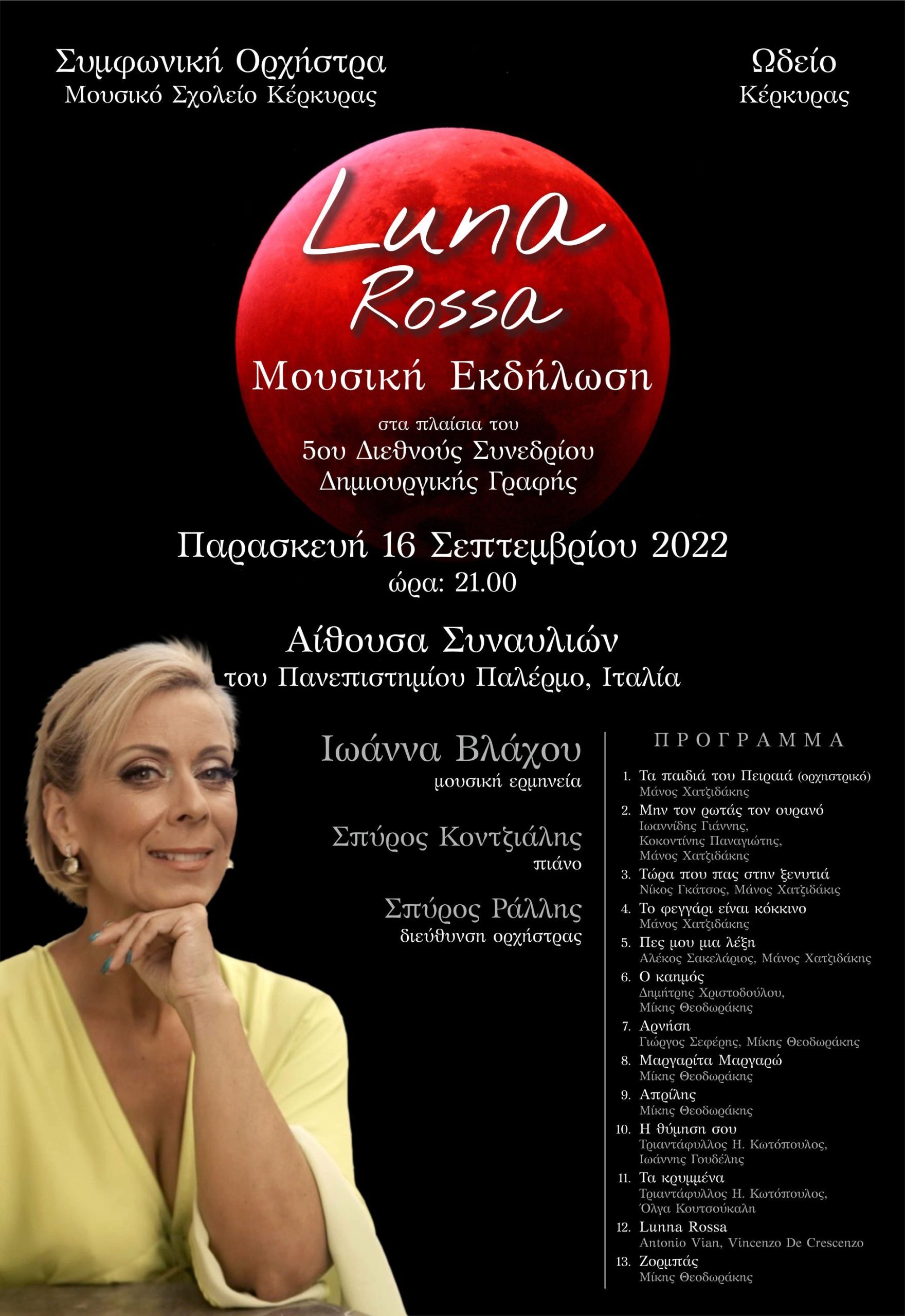 τη Συμφωνική Ορχήστρα του Μουσικού Σχολείου Κέρκυρας και τη συμμετοχή μουσικών του Ωδείου Κερκύρας. H μουσική παράσταση που φέρει τον τίτλο «Luna Rossa» θα ταξιδέψει τους, ανά τον κόσμο ακροατές, στα ξεχωριστά τραγούδια των Μάνου Χατζηδάκι, Μίκη Θεοδωράκη και Γιώργου Κατσαρού, σε παραδοσιακά κομμάτια με διάλεκτο της κάτω Ιταλίας, καθώς και σε τραγούδια από την προσωπική της δισκογραφία. Οι συνθέσεις της παράστασης έχουν ενορχηστρωθεί από τους Μάριο Δαπέργολα και Κίμωνα Χυτήρη. Η διεύθυνση ορχήστρας είναι του Σπύρου Ράλλη, ενώ στο πιάνο θα βρίσκεται ο Σπύρος Κοντζιάλης.