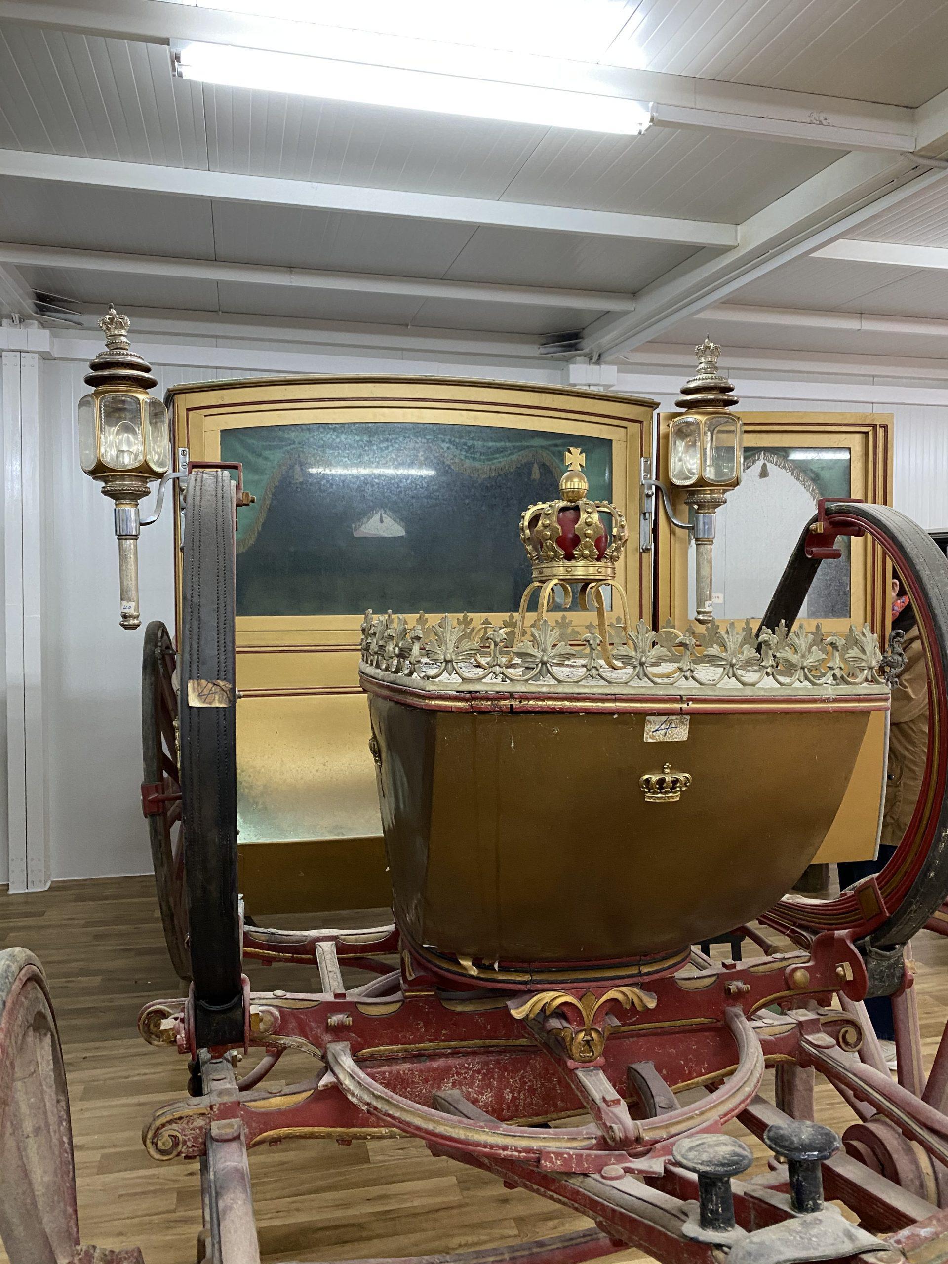 Πρόκειται για 12 άμαξες, με σημαντικότερες δυο από αυτές: Την κλειστή άμαξα που χρησιμοποιήθηκε στον γάμο της Βασίλισσας Σοφίας της Ισπανίας, τύπου coach -είχε αγοραστεί από τον βασιλιά Γεώργιο Α’ το 1871- και την ειδικά τροποποιημένη, ανοιχτή άμαξα, τύπου landau, που χρησιμοποιήθηκε στους γάμους του τ. Βασιλιά Κωνσταντίνου και της Άννας Μαρίας. Επίσης, περιλαμβάνονται μια χρυσή άμαξα τύπου Coupe, 3 άμαξες τύπου Berlin, 2 ανοιχτές τύπου Phaethon, μία κυνηγετική και 3 μόνιππα.