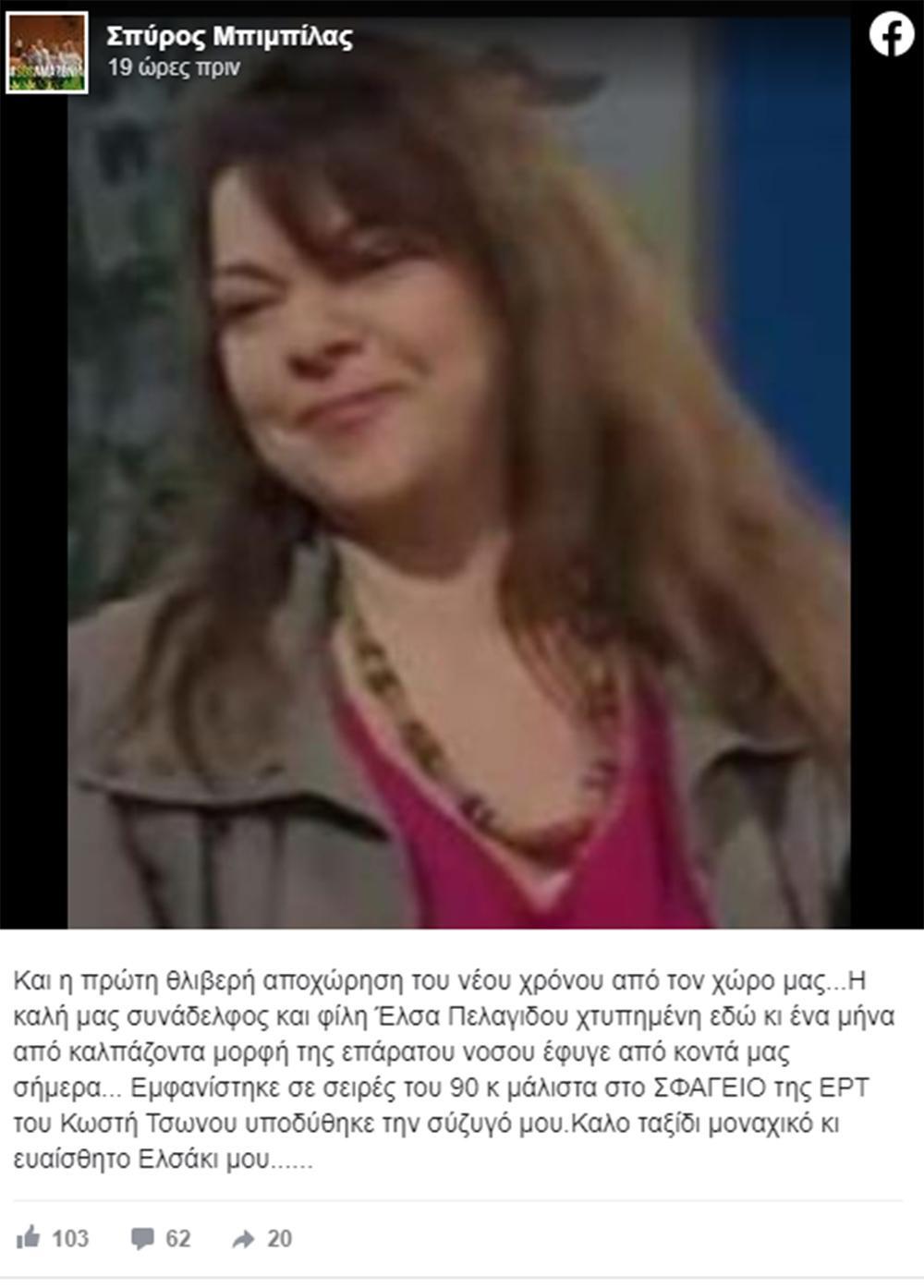 «Και η πρώτη θλιβερή αποχώρηση του νέου χρόνου από τον χώρο μας…Η καλή μας συνάδελφος και φίλη Έλσα Πελαγίδου χτυπημένη εδώ κι ένα μήνα από καλπάζοντα μορφή της επάρατου νόσου έφυγε από κοντά μας σήμερα… Εμφανίστηκε σε σειρές του 90 κ μάλιστα στο ΣΦΑΓΕΙΟ της ΕΡΤ του Κωστή Τσώνου υποδύθηκε την σύζυγό μου. Καλό ταξίδι μοναχικό κι ευαίσθητο Ελσάκι μου……», έγραψε χαρακτηριστικά.
