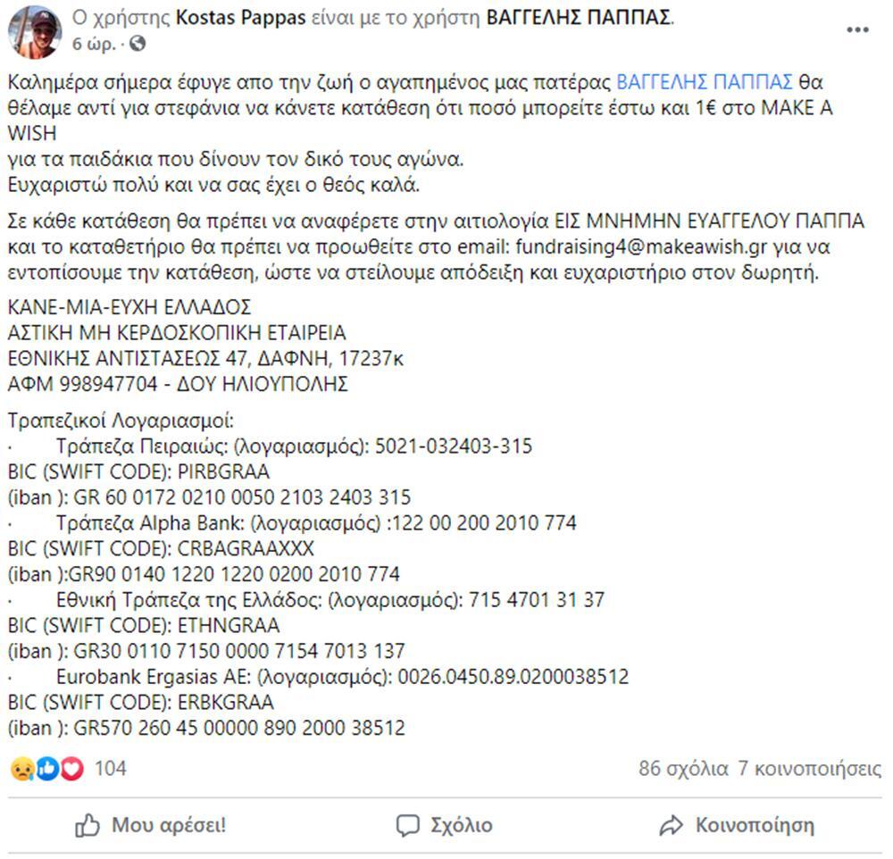 «Καλημέρα σήμερα έφυγε από την ζωή ο αγαπημένος μας πατέρας ΒΑΓΓΕΛΗΣ ΠΑΠΠΑΣ θα θέλαμε αντί για στεφάνια να κάνετε κατάθεση ότι ποσό μπορείτε έστω και 1€ στο MAKE A WISH για τα παιδάκια που δίνουν τον δικό τους αγώνα. Ευχαριστώ πολύ και να σας έχει ο θεός καλά. Σε κάθε κατάθεση θα πρέπει να αναφέρετε στην αιτιολογία ΕΙΣ ΜΝΗΜΗΝ ΕΥΑΓΓΕΛΟΥ ΠΑΠΠΑ και το καταθετήριο θα πρέπει να προωθείτε στο email: fundraising4@makeawish.gr για να εντοπίσουμε την κατάθεση, ώστε να στείλουμε απόδειξη και ευχαριστήριο στον δωρητή», έγραψε ο Κώστας Παππάς.