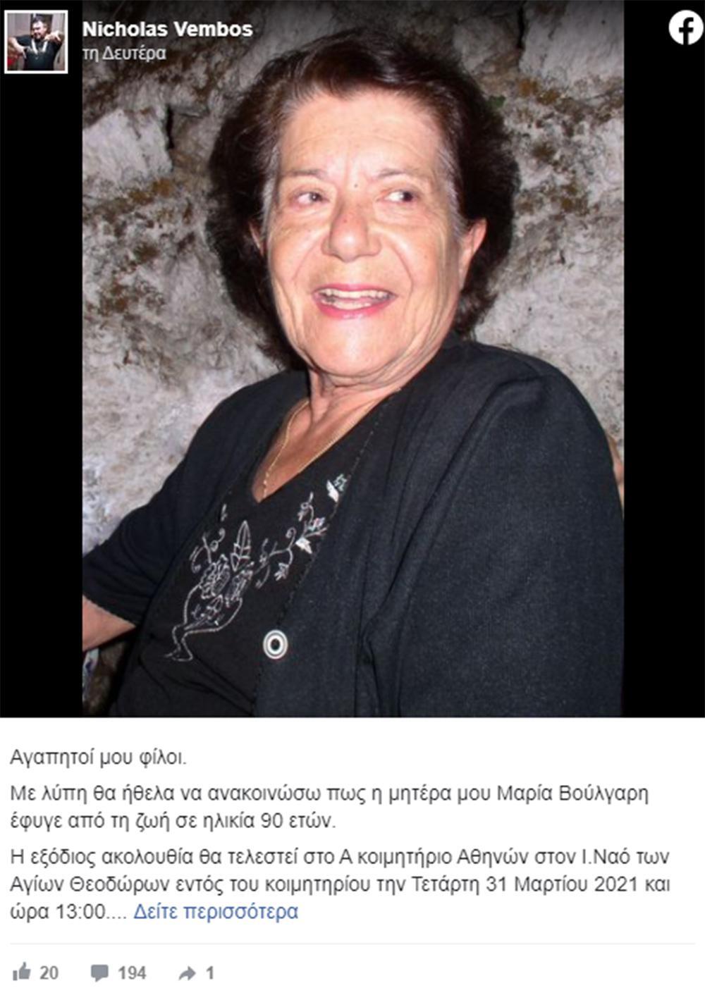Με λύπη θα ήθελα να ανακοινώσω πως η μητέρα μου Μαρία Βούλγαρη έφυγε από τη ζωή σε ηλικία 90 ετών. Η εξόδιος ακολουθία θα τελεστεί στο Α κοιμητήριο Αθηνών στον Ι. Ναό των Αγίων Θεοδώρων εντός του κοιμητηρίου την Τετάρτη 31 Μαρτίου 2021 και ώρα 13:00.