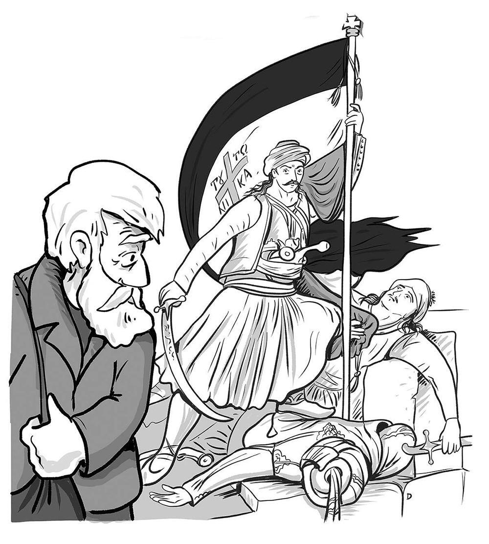 Ο υποβλητικός έφιππος ανδριάντας του Θεόδωρου Κολοκοτρώνη, έργο του γλύπτη Λάζαρου Σώχου, στο μέγαρο της Παλαιάς Βουλής οδηγεί στο κατώφλι του Εθνικού Ιστορικού Μουσείου. Εκεί περιηγηθήκαμε στην περιοδική επετειακή έκθεση για τη συμπλήρωση των 200 χρόνων από την Επανάσταση του 1821, η οποία βασίζεται στη συναρπαστική ομώνυμη σύγχρονη ιστορία του graphic novel του σπουδαίου σκιτσογράφου Αντώνη Νικολόπουλου ή Soloup, όπως υπογράφει τις δημιουργίες του, το οποίο κυκλοφόρησε πρόσφατα από τις εκδόσεις Ικαρος.