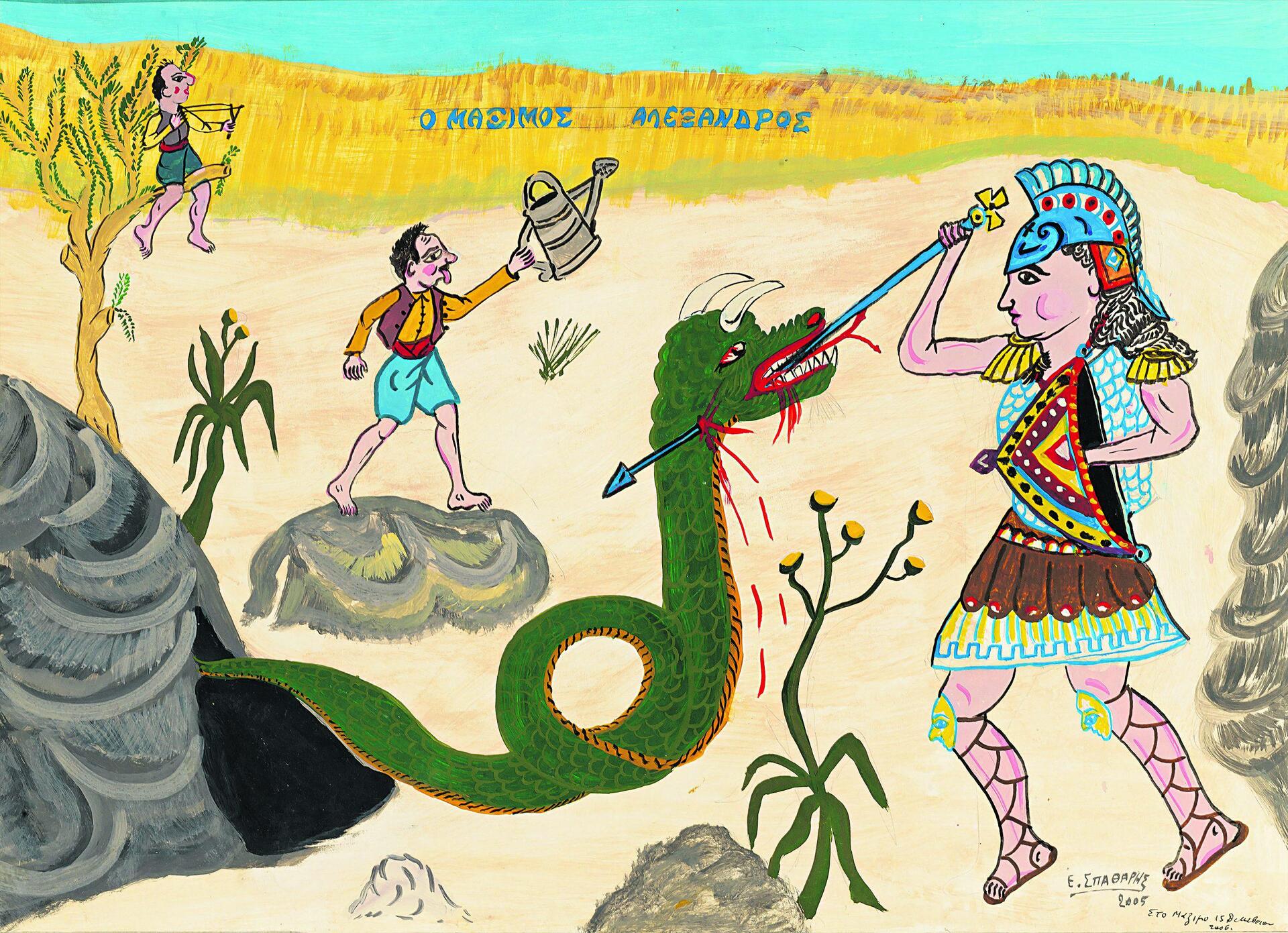 Οπως μας αναφέρει, ανάμεσα στα έργα ξεχωρίζουν εκείνα των δημιουργών που δεν βρίσκονται πια στη ζωή, όπως η σύνθεση με τον Μεγαλέξανδρο και το καταραμένο φίδι του Ευγένιου Σπαθάρη ή το πέτρινο πορτραίτο του ναΐφ Αιγινίτη γλύπτη Γιώργου Σκλάβαινα που θυμίζει εντυπωσιακά το πορτρέτο του Τεριάντ από τον Θεόφιλο, κι ακόμη παλαιότερα σπουδαία έργα όπως οι τρισδιάστατοι μαχητές-ήρωες του Τάσου Μαντζαβίνου ή το τοπίο της σπουδαίας Μυτιλινιάς Νίκης Ελευθεριάδη.
