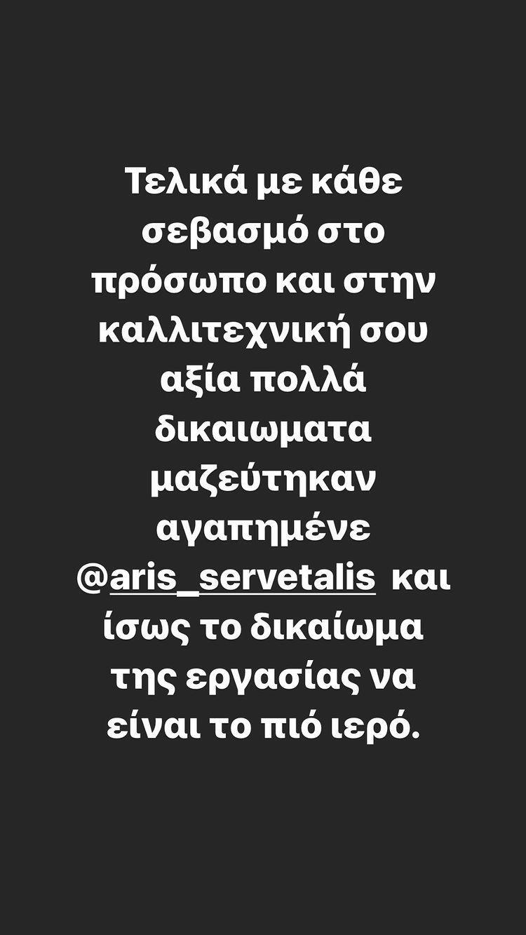 Έπειτα από τις αντιδράσεις, ο Άρης Σερβετάλης έδωσε την απάντηση του μέσω του προσωπικού του λογαριασμού στο Instagram: