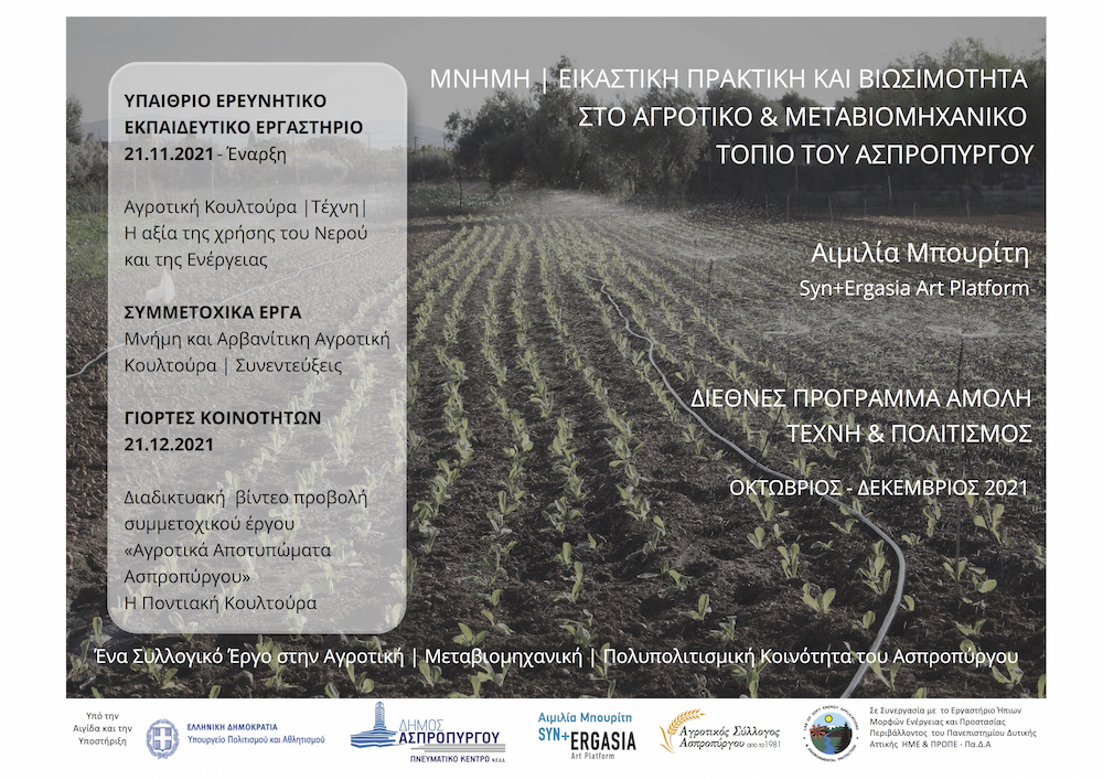Στις 21 Δεκεμβρίου θα πραγματοποιηθεί η διαδικτυακή προβολή του βίντεο έργου με τίτλο «Αγροτικά αποτυπώματα Ασπροπύργου|| Η Ποντιακή κουλτούρα». Το βίντεο έργο είναι μία καταγραφή του συμμετοχικού έργου που είχε πραγματοποιηθεί τον Ιούλιο 2020 σε γειτονιά της περιοχής Γκορυτσάς Ασπροπύργου και αποτελείται από συμμετοχική δράση, site specific installation performance, μαρτυρίες και τραγούδια από Πόντιους κατοίκους από τον Ασπρόπυργο και την Ελευσίνα. Το έργο μεταφέρει τις μαρτυρίες των Ποντίων για τη σχέση τους με την καλλιεργήσιμη γη και την ιστορία τους, αποκτά όμως μέσα στην περίοδο της πανδημίας μία επιπρόσθετη αξία καθώς ανασύρονται μνήμες που αφορούν μεταδοτικές σοβαρές ασθένειες όπως Τσιχότκα, Βράσα, Τσουμάμ όταν οι συμμετέχοντες ή οι πρόγονοι τους κατοικούσαν στις πρώην δημοκρατίες της Σοβιετικής Ένωσης. Το έργο μεταφέρει το μήνυμα ότι η δύναμη της τέχνης, η αλληλεγγύη της κοινότητας και η ιστορική μνήμη λειτουργούν απελευθερωτικά σε καιρούς πανδημίας.