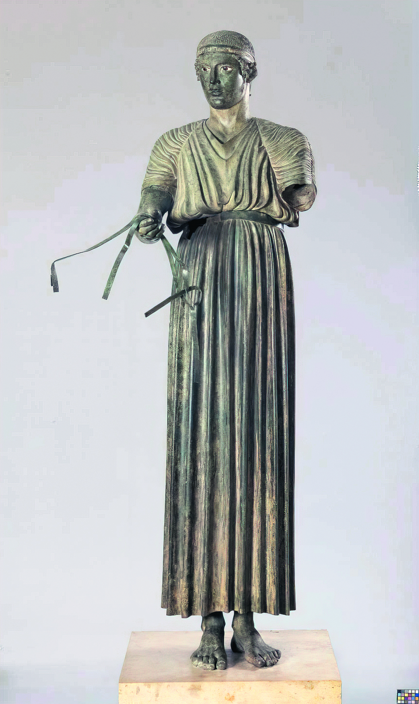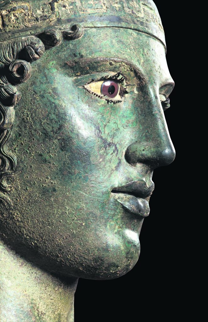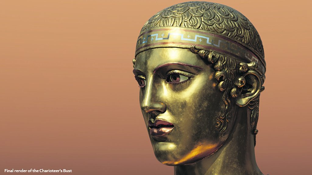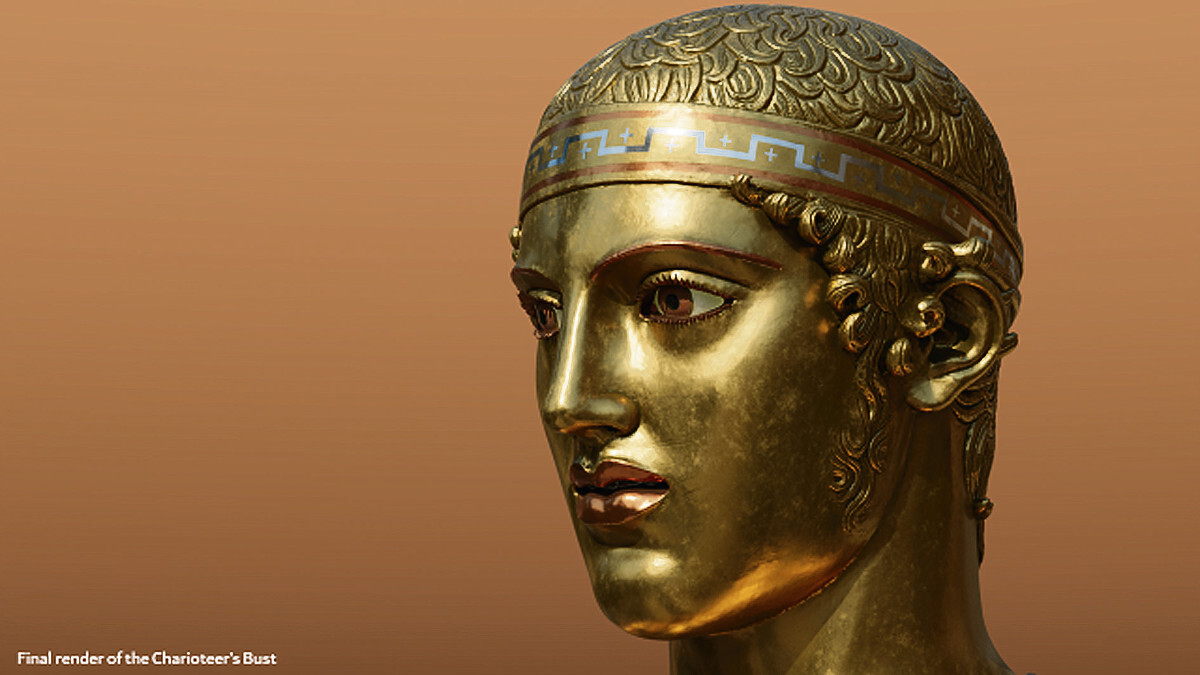 Πίσω, δηλαδή, από το πρασινωπό χρώμα του μνημειώδους αγάλματος που δεσπόζει σήμερα στο μουσείο των Δελφών και έχει προκληθεί από την οξείδωση του χαλκού, κρυβόταν η αυθεντική χρυσίζουσα όψη του ορείχαλκου ενός ευθυτενούς νέου με το βλέμμα του νικητή της αρματοδρομίας των Πυθίων με κοκκινωπά χείλη, χρωματισμένα φρύδια και μάτια σμιλεμένα από διαφορετικούς λίθους να εκφράζουν δύναμη και αυτοκυριαρχία.
