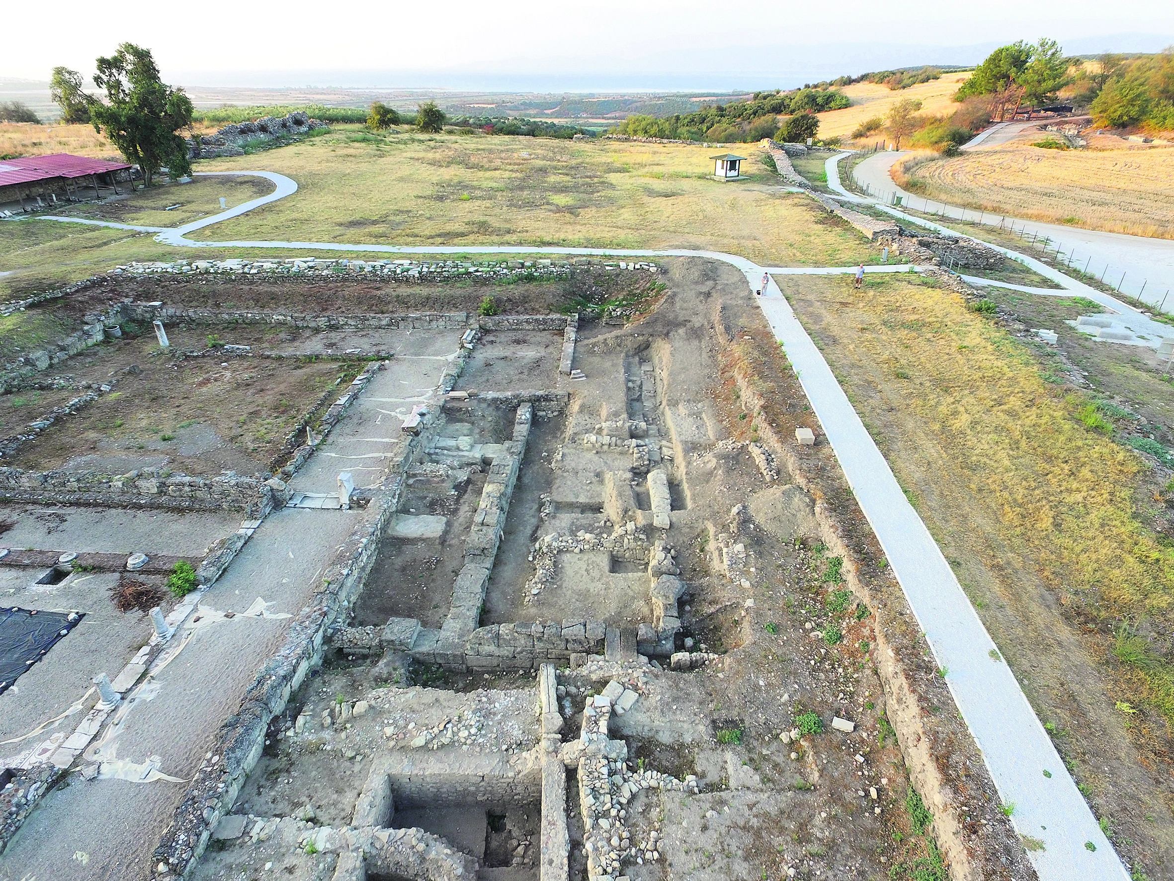Στην εισήγησή του, ο καθηγητής υπογράμμισε ότι, κατά την ανασκαφική περίοδο του 2024, η έρευνα επικεντρώθηκε δυτικά της πρωτοβυζαντινής Βασιλικής Γ’, εκεί όπου έχει αποκαλυφθεί ένα επίμηκες ορθογώνιο κτίριο με ισχυρούς τοίχους, των οποίων σώζονται οι κατώτεροι δόμοι από μεγάλες καλοπελεκημένες πωροπλίνθους. Να σημειωθεί ότι από το κτίσμα σώζεται μόνο το δυτικό τμήμα του, ενώ το υπόλοιπο έχει καταστραφεί από τη Βασιλική. Τα έως τώρα ευρήματα χρονολογούνται στην αρχική φάση ανέγερσης, μέσα στον 4ο αι. π.Χ.