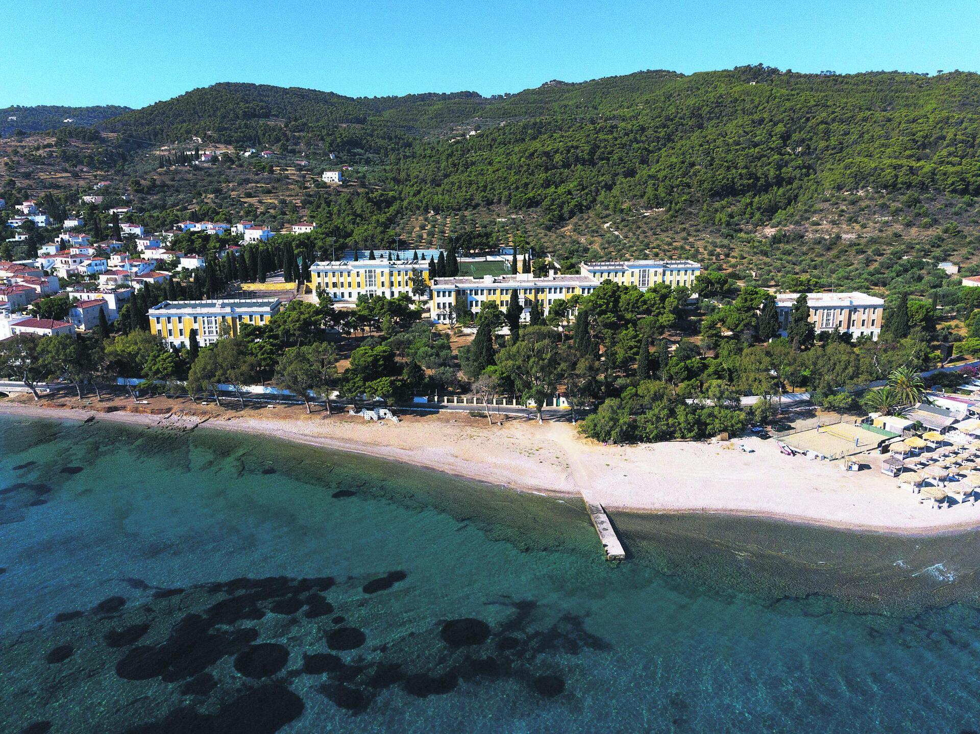 Πίσω από το εντυπωσιακό συγκρότημα, που αναπτύσσεται σε ένα μοναδικό campus 120 στρεμμάτων, εκτείνεται το πανέμορφο πευκοδάσος, καθώς και ο ελαιώνας, που ανήκει στη σχολή και καλύπτει περίπου το μισό νησί.