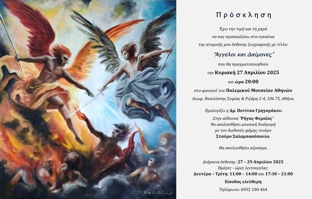 Μέσα από τα χρώματα και τον καμβά επιχειρώ να αποδώσω τον τρόπο με τον οποίο βιώνουμε σήμερα αυτή τη διαρκή πάλη. Οι άγγελοι συμβολίζουν την ελπίδα, την προστασία και την ανιδιοτελή αγάπη, ενώ οι δαίμονες αποτυπώνουν τους φόβους, τις εσωτερικές συγκρούσεις και τις σκοτεινές πτυχές της ανθρώπινης φύσης.
