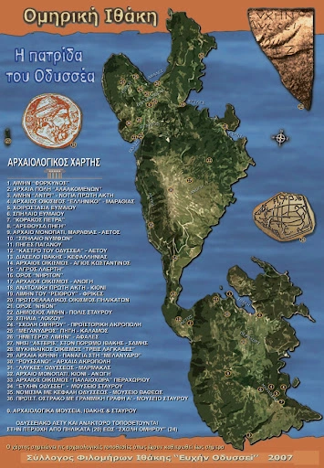 Με αυτές τις σκέψεις σας προτρέπω να επισκεφθείτε το νησί του, την Ιθάκη και να δείτε από κοντά τα μέρη που έζησε και έδρασε ο Οδυσσέας, όπως είναι το λιμάνι του Φόρκυνα (σήμερα λιμάνι Πόλις) όπου τον άφησαν κοιμισμένο οι Φαίακες. Επίσης μπορείτε να δείτε τη σπηλιά των Ναϊάδων Νυμφών που έκρυψε τα δώρα των Φαιάκων (σήμερα σπήλαιο Λοΐζου), πριν συναντηθεί με τον αγαπημένο του χοιροβοσκό Εύμαιο. Ακόμη θα δείτε και τα ερείπια του παλατιού του, που έγινε η περίφημη μνηστηροφονία (30/10/1207 π.Χ), στη σημερινή θέση, Σταυρός Ιθάκης.