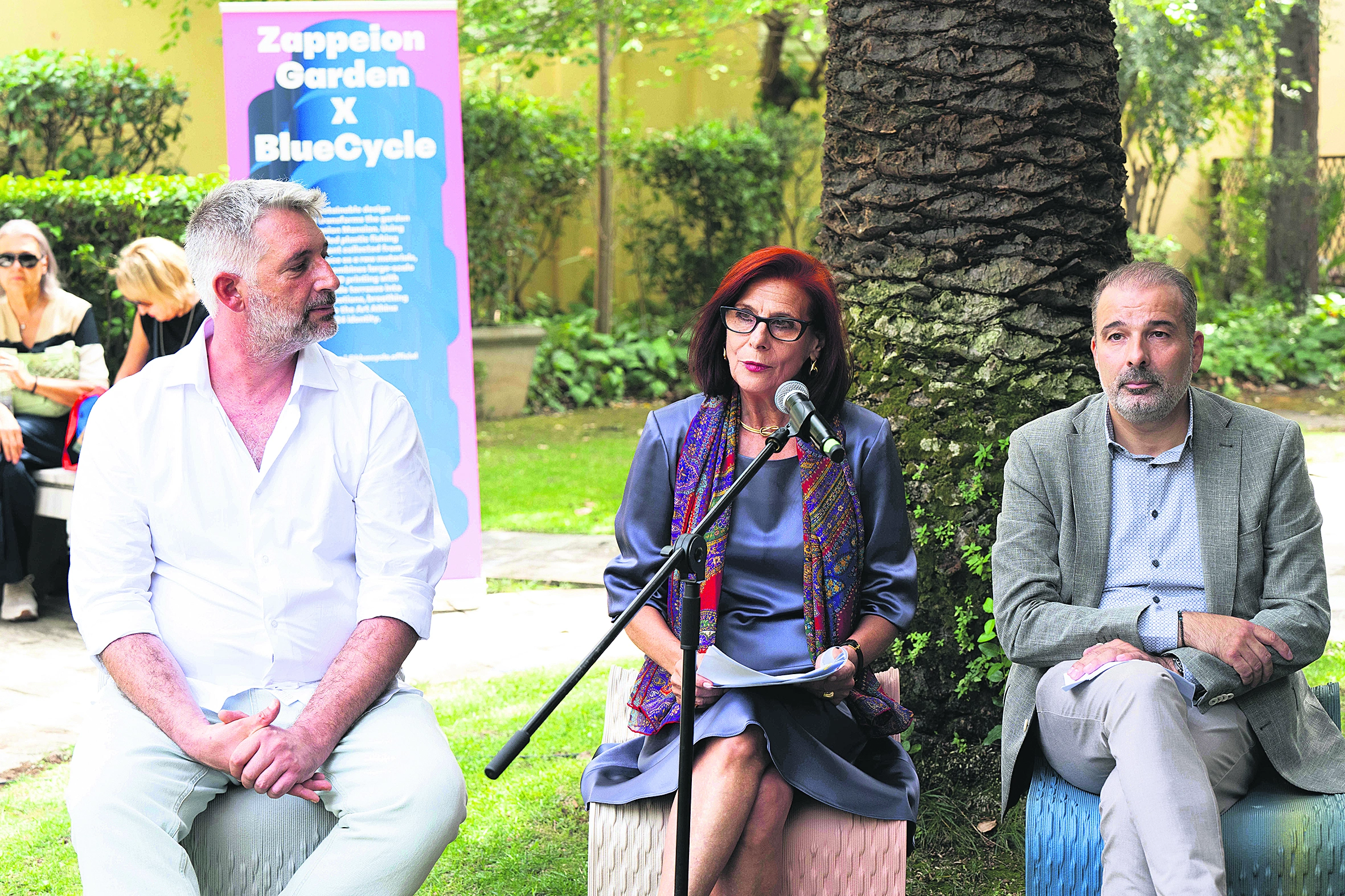 Ακόμα μπορείτε να περάσετε χρόνο στον μικρό εσωτερικό κήπο, που είναι εξοπλισμένος με έπιπλα από ανακυκλωμένα υλικά, βασισμένα στην οπτική ταυτότητα της Art Athina 2024, από την Blue Cycle.