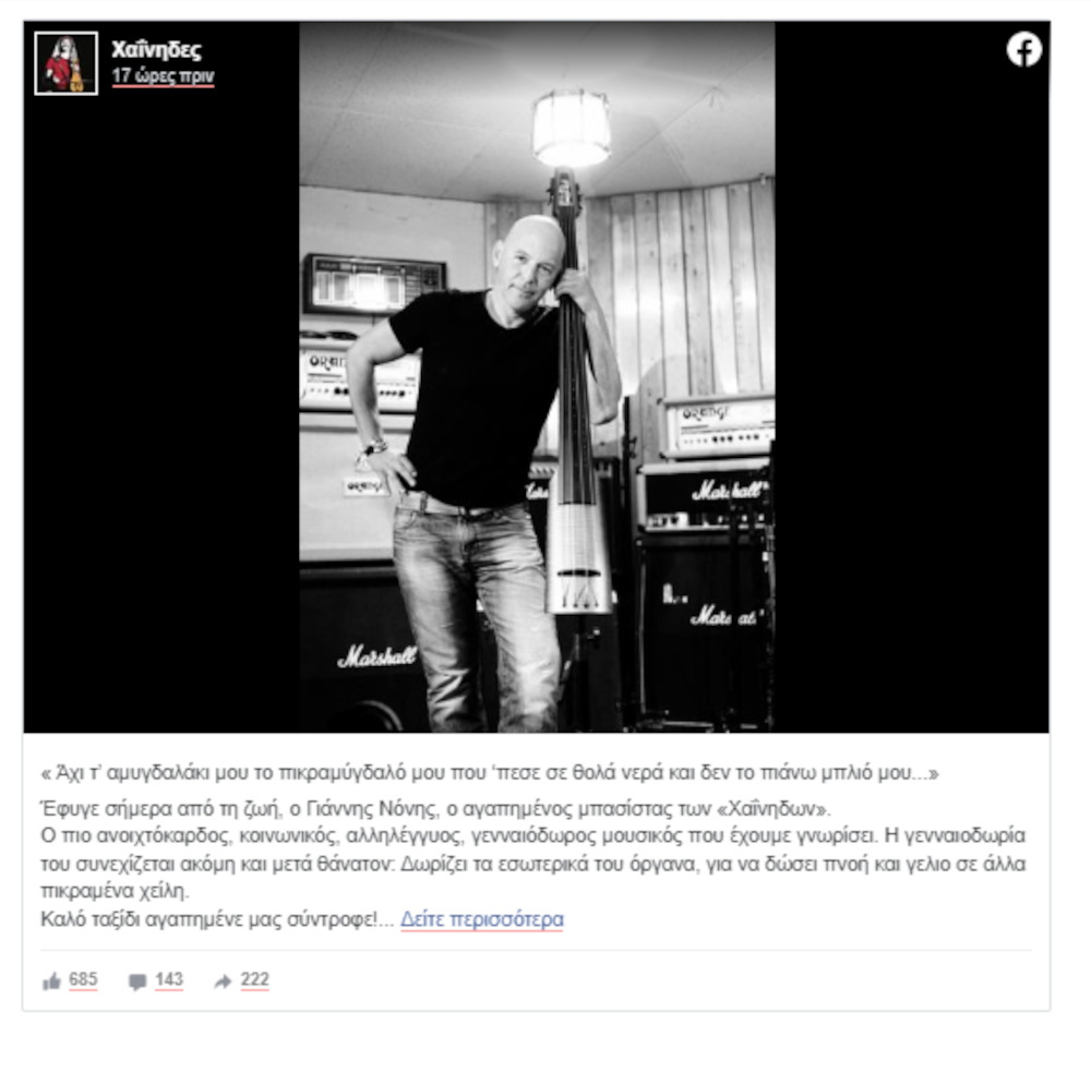 H ανάρτηση των Χαΐνηδων για τον θάνατο του Γιάννη Νόνη: