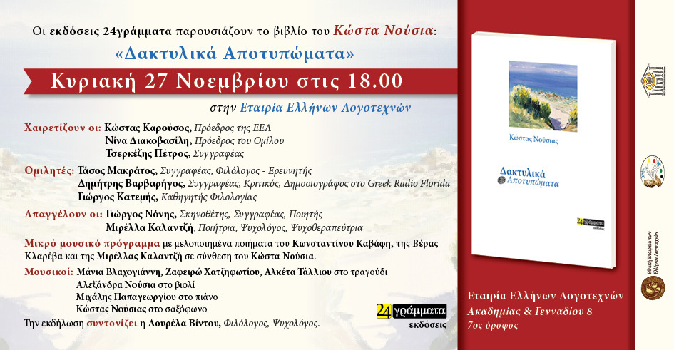 Η παρουσίαση θα πραγματοποιηθεί την Κυριακλη 27 Νοεμβρίου στην Εταιρία Ελλήνων Λογοτεχνών Ακαδημίας & Γενναδίου 8, 7ος όροφος.