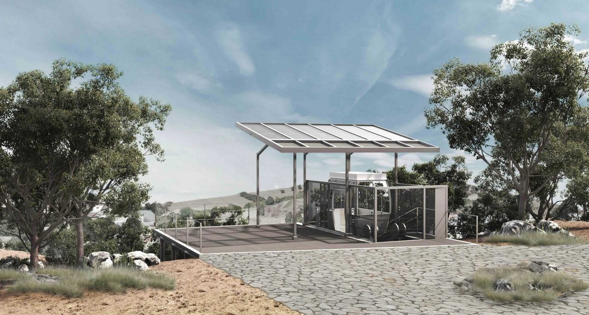 Το κτήριο αφετηρίας είναι υπόγειο, ώστε να μην κυριαρχεί στη συνολική ανάπλαση της Πλατείας. Το κτήριο άφιξης του επικλινούς ανελκυστήρα είναι χωροθετημένο σε στάθμη για την ομαλή πρόσβαση από και προς τα εκδοτήρια των εισιτηρίων, στην είσοδο του Σπηλαίου. Δημιουργείται νέο μονοπάτι, το οποίο οι επισκέπτες μπορούν να χρησιμοποιούν για να κινηθούν ανάμεσα στα εκδοτήρια εισιτηρίων του Σπηλαίου και στο σταθμό άφιξης του επικλινούς ανελκυστήρα. Τα υλικά επιλέχθηκαν ώστε να αξιοποιηθούν τα προϊόντα εκσκαφής, το κτήριο να ενσωματωθεί στο φυσικό περιβάλλον δημιουργώντας ένα δροσερό περιβάλλον αναμονής, για χωρίς την χρήση μηχανικών μέσων.
