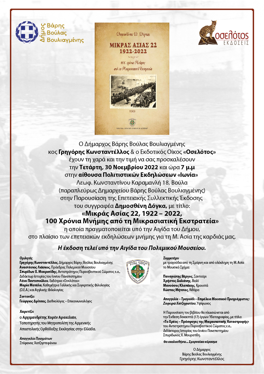 Η παρουσίαση της Επετειακής Ποιητικής συλλογής θα γίνει την Τετάρτη 30 Νοεμβρίου στις 7μ.μ. στην αίθουσα Πολιτιστικών Εκδηλώσεων “ΙΩΝΊΑ”, στην πρώτη επίσημη παρουσίαση στην Αττική. Την παρουσίαση που τελεί υπό την αιγίδα του Πολεμικού Μουσείου, χαιρετίζει και την προλογίζει ο ίδιος ο Προέδρος του Μουσείου και περιέχει 70 αυθεντικές φωτογραφίες από το επίσημο φωτογραφικό αρχείο της Εκστρατείας .