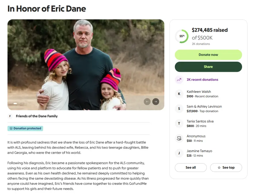 Η ανακοίνωση της καμπάνιας συνοδεύτηκε από αναλυτικές σημειώσεις για τη χρήση των πόρων και την επιθυμία των δωρητών να προσφέρουν οικονομική σταθερότητα στις δύο ανήλικες κόρες. Σύμφωνα με τα επίσημα στοιχεία της σελίδας, έχουν συγκεντρωθεί περίπου 275.000 δολάρια, ποσό που υπερβαίνει τον αρχικό στόχο αλλά παραμένει κάτω από το νέο όριο των 500.000 δολαρίων. Ο Έρικ Ντέιν είχε χάσει τη μάχη με την πλάγια μυατροφική σκλήρυνση (ALS), νόσημα που έγινε γνωστό στο ευρύ κοινό κατά τα τελευταία χρόνια της ζωής του. Οι φίλοι και συνεργάτες του, σε συνεννόηση με την οικογένεια, σχεδιάζουν τη διαχείριση των εσόδων της καμπάνιας ώστε να καλυφθούν άμεσες και μεσοπρόθεσμες ανάγκες των παιδιών.