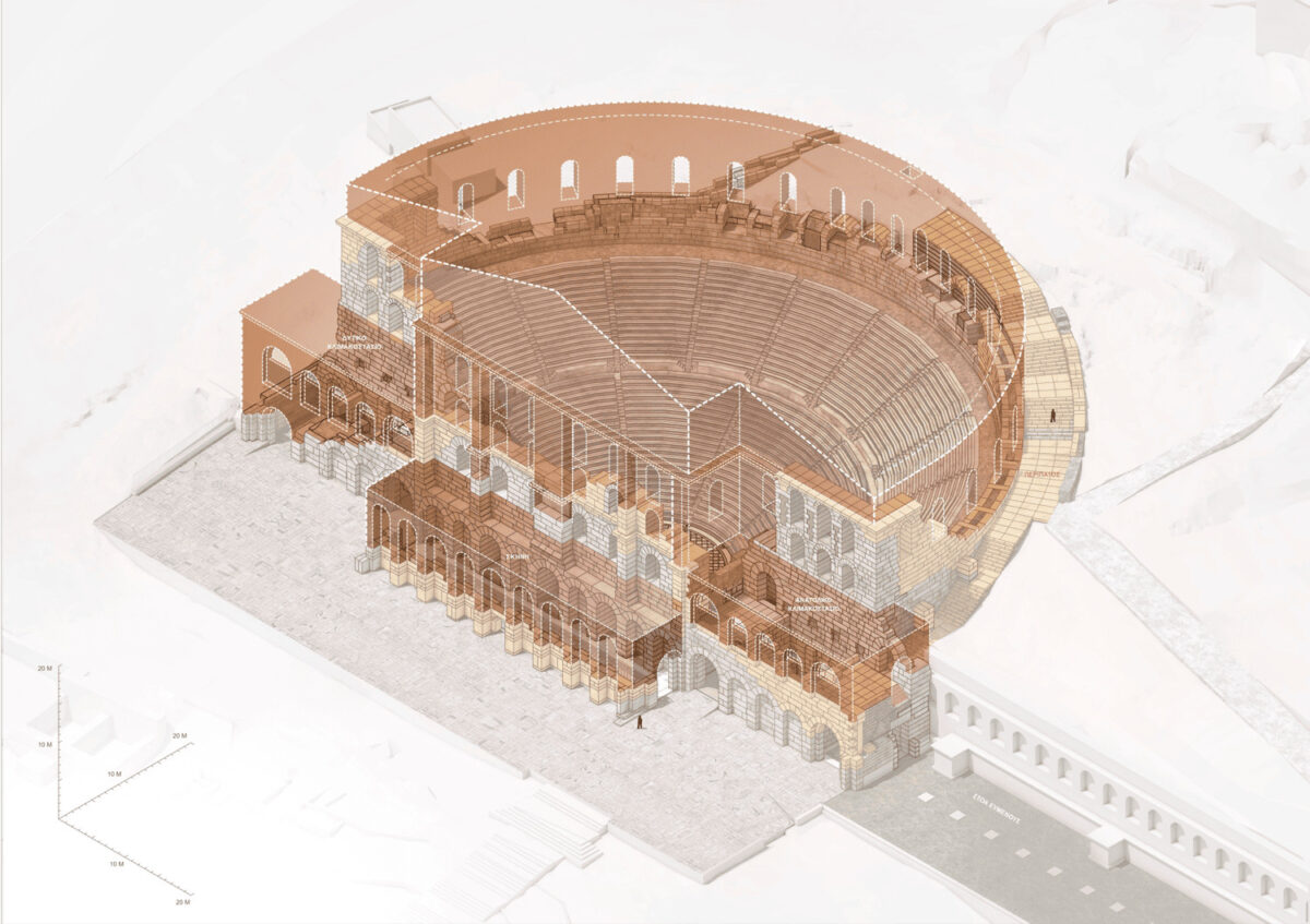 1. Στη Σκηνική Αίθουσα, όπου προβλέπεται η αποκατάσταση του περιγράμματός της σε ύψος ικανό να αναδείξει την τρίτη διάστασή της, αλλά και να εξυπηρετήσει την εγκατάσταση των περιοδικών κατασκευών για τη λειτουργία των παραστάσεων.
