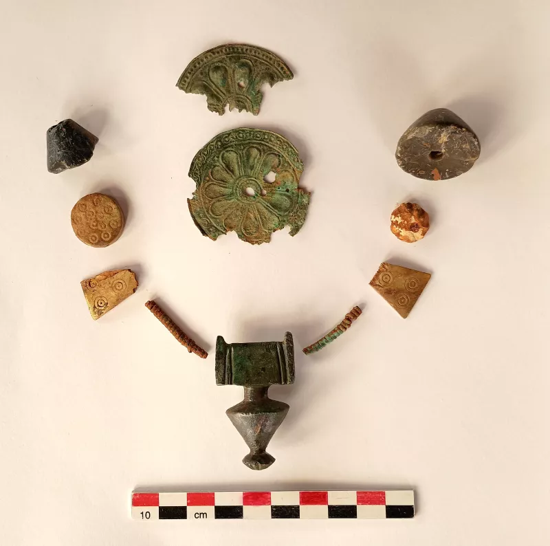 Στην ίδια συστάδα βρέθηκε ταφή ανήλικου κοριτσιού περίπου 4 ετών, επίσης στεφανωμένη με χάλκινο διάδημα με ένθετους ρόδακες, γεγονός που υποδεικνύει πιθανή συγγενική σχέση. Άλλοι τάφοι απέδωσαν εντυπωσιακά κτερίσματα: δύο υπερμεγέθεις πόρπες βοιωτικού τύπου, περιδέραια με αγγειόσχημα περίαπτα, οστέινες και ελεφαντοστέινες χάνδρες, ψήφοι από ήλεκτρον, ελασμάτινοι ρόδακες, χάλκινα ενώτια, ψέλλια και σπειροειδή δακτυλίδια. Μεταγενέστερη γυναικεία ταφή των μέσων του 6ου αι. π.Χ. συνοδευόταν από κύλικα «Τύπου Σιάννων» με παράσταση πετεινών και τριφυλλόσχημη οινοχόη με διακόσμηση μυθικών πλασμάτων και τον θεό Ερμή ως «ψυχοπομπό». Μελανόμορφα και μελανόγραφα αγγεία που συνδέονται με το Κεραμεικό Εργαστήριο της Ακραιφίας επιβεβαιώνουν την πολιτισμική και οικονομική διασύνδεση της περιοχής, ενώ τα ευρήματα συνομιλούν με το μεταβατικό κοινωνικοπολιτικό πλαίσιο των μέσων του 7ου αι. π.Χ., όταν κλονίζονταν οι παραδοσιακές μορφές εξουσίας.