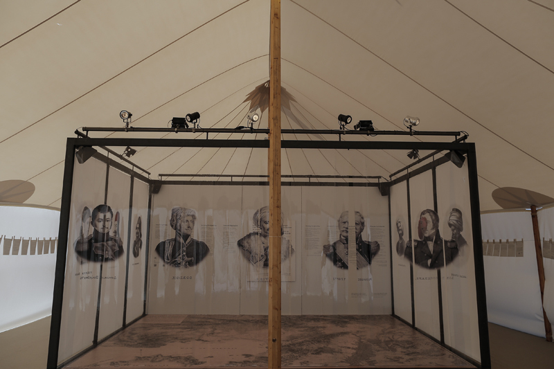 Στο πάρκιν του Παλαιού Ελαιουργείου έχει στηθεί η «Πολεμική Σκηνή»-τέντα που παραπέμπει σε αρχηγείο οπλαρχηγού του 19ου αιώνα, με αρχειακά τεκμήρια από ντόπιους ιστοριοδίφες και συλλέκτες. Μέσα από την καλαίσθητη σύγχρονη μουσειολογία της, ο επισκέπτης ανακαλύπτει θραύσματα από τη σχέση της Ελευσίνας με τον αγώνα ανεξαρτησίας, το στρατόπεδο του αρχιστράτηγου Καραϊσκάκη το 1826 στην Ελευσίνα, τα ίχνη στρατιάς αφανών ηρώων που δεν έγιναν σύμβολα. Έχει στηθεί αντικρυστά της εικαστικής εγκατάστασης «Θραύσματα»-60 στήλες από καθρέφτες, με χαραγμένους, στα ελληνικά και αγγλικά, τους στίχους από τους Ελεύθερους Πολιορκημένους του Διονυσίου Σολωμού. Η διάταξή τους παραπέμπει σε στρατιωτική παράταξη, αλλά και σε κοιμητήριο.