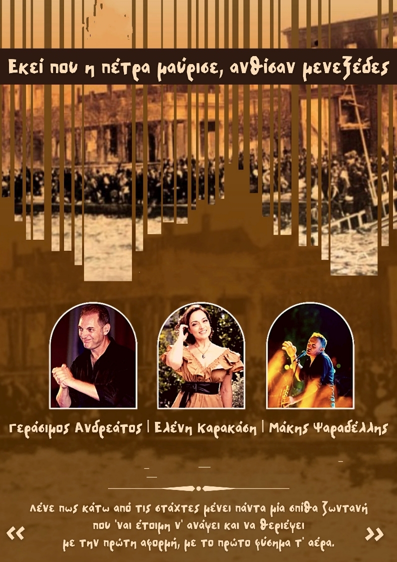 Με αφορμή τη συμπλήρωση των εκατό χρόνων από τη Μικρασιατική καταστροφή οι Γεράσιμος Ανδρεάτος και Μάκης Ψαραδέλλης, σε σκηνοθεσία της Ελένης Καρακάση, δημιούργησαν και παρουσιάζουν μία μουσική παράσταση γεμάτη συγκίνηση και μνήμες!Οι άνθρωποι που συμμετέχουν, απόγονοι, όλοι, μικρασιατών προσφύγων του 1922, δεν αφήνουν τη σπίθα της μνήμης να σβήσει. Με φαντασία, λόγο και ήχους γεννημένους από τη μουσική μας παράδοση, η «Μνήμη» (Ελένη Καρακάση) σε αυτό το μουσικό ταξίδι μοιράζεται μαζί μας ιστορίες και τραγούδια, κληρονομιά των παππούδων μας από τις αλησμόνητες πατρίδες τους. Τα τραγούδια τους δεν μιλούν μόνο για τον ξεριζωμό τους αλλά υμνούν κι όλα εκείνα που μας κάνουν ανθρώπους. Για την αγάπη, τον έρωτα, τη φιλία, την αδελφοσύνη.