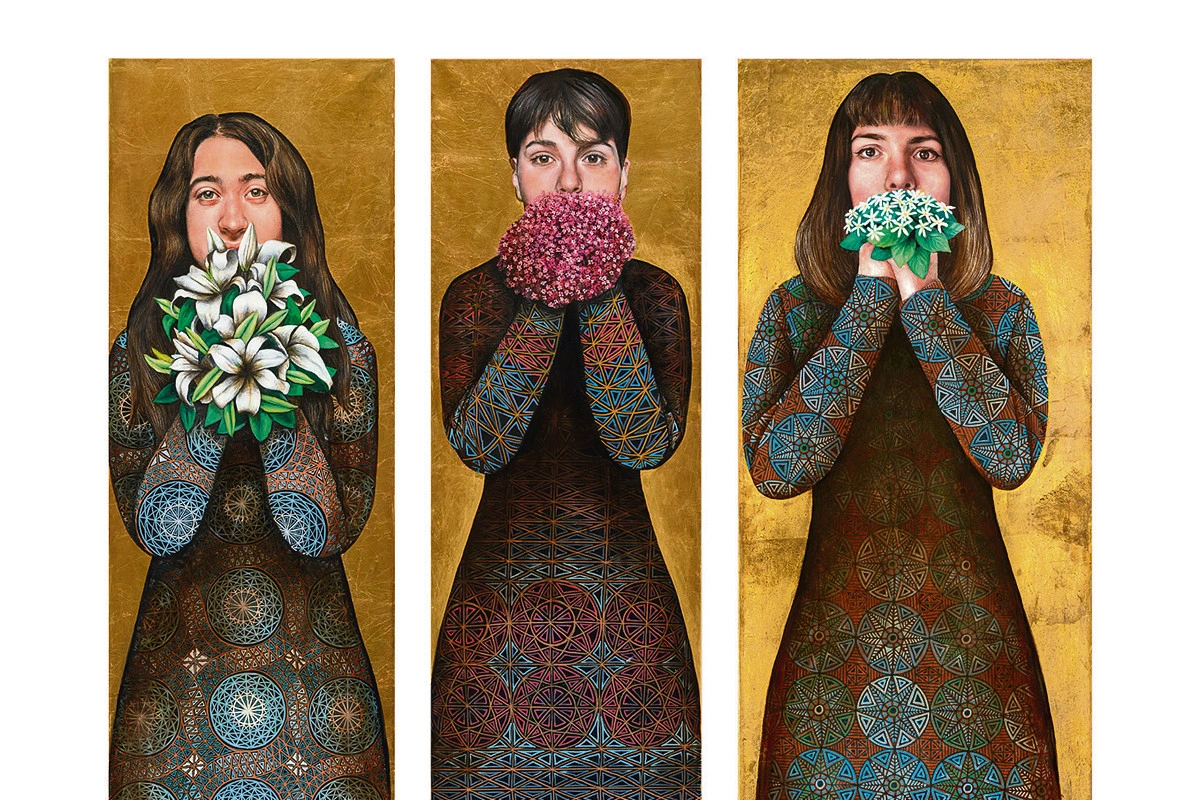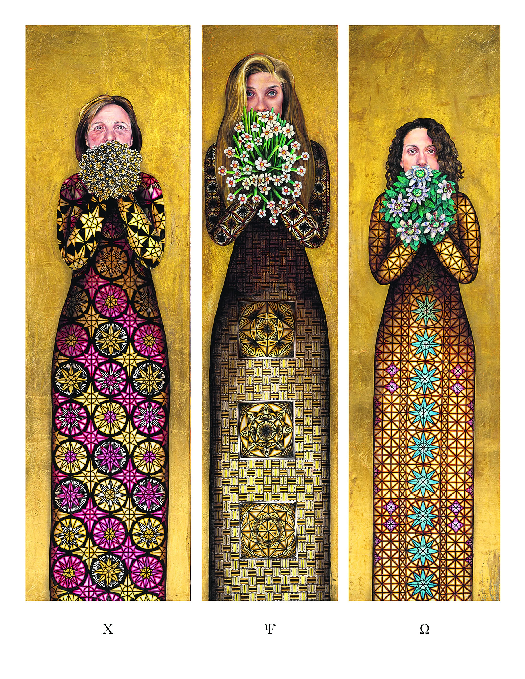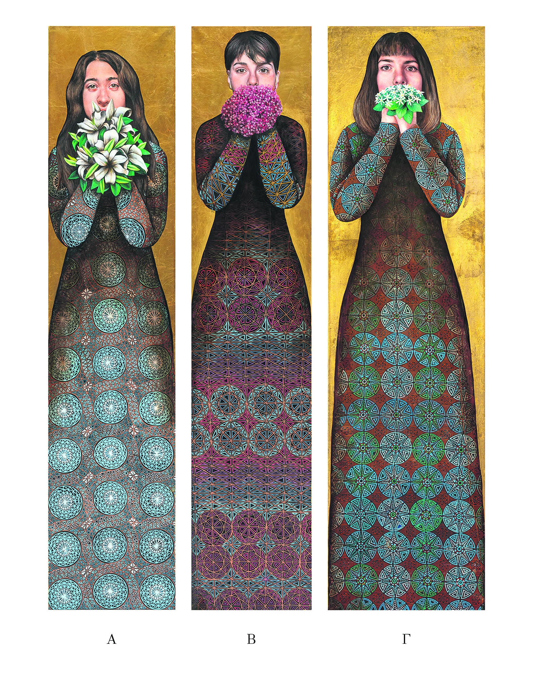 Κάθε γράμμα της αλφαβήτου αντιστοιχεί σε ένα λουλούδι… Οι 24 γυναικείες φιγούρες τοποθετούνται αλφαβητικά, ενώ τα ενδυματολογικά τους μοτίβα εξελίσσονται διαδοχικά. Τα άνθη που καλύπτουν το στόμα, αποτυπώνοντας τον περιορισμό της φωνής, λειτουργούν ως φίμωτρα, αλλά ταυτόχρονα γίνονται σύμβολα της ηχηρής σιωπής τους.