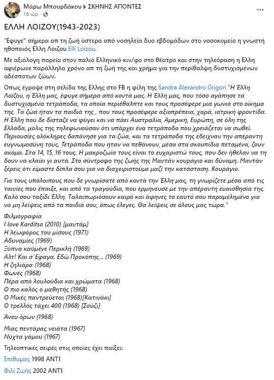 «”Έφυγε” σήμερα από τη ζωή ύστερα από νοσηλεία δυο εβδομάδων στο νοσοκομείο η γνωστή ηθοποιός Έλλη Λοΐζου. Με αξιόλογη πορεία στον παλιό ελληνικό κινηματογράφο, στο θέατρο και στην τηλεόραση η Έλλη αφιέρωνε παράλληλα χρόνο απ’ τη ζωή της και χρήμα για την περίθαλψη δυστυχισμένων αδέσποτων ζώων».