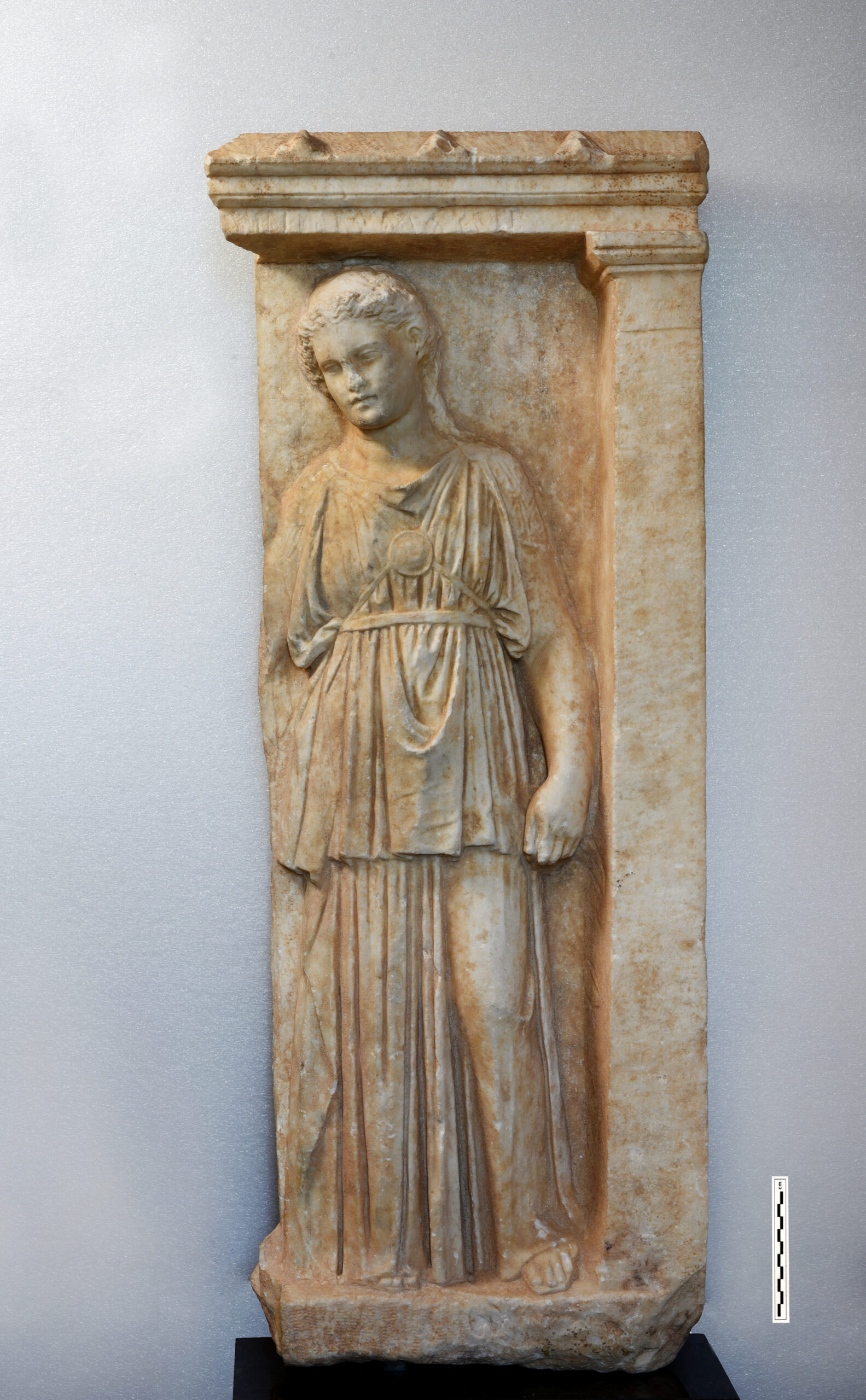 2. Τμήμα αττικού επιτύμβιου ναΐσκου από πεντελικό μάρμαρο, ύψους 0,95μ. και πλάτους 0,42μ. με ανάγλυφη παράσταση. Στο επιστύλιο σώζονται γράμματα νεότερης επιγραφής, που οφείλονται στην επαναχρησιμοποίηση του μνημείου σε μεταγενέστερη της κατασκευής του εποχή. Εικονίζεται νεαρό κορίτσι που παριστάνεται όρθιο, κατενώπιον με την κεφαλή να κλίνει ελαφρώς στα δεξιά. Φορεί χιτώνα με μανίκια και αττικό πέπλο ζωσμένο κάτω από το στήθος. Το ένδυμα συγκρατούν μασχαλιστήρες που διασταυρώνονται χιαστί μπροστά στο στήθος και στο μέσο ενώνονται με κυκλικό μετάλλιο. Χρονολογείται γύρω στα 330-320 π.Χ. Εντυπωσιακή είναι η ομοιότητα της στάσης του κοριτσιού με εκείνη της νεαρής Αγνοστράτης που απεικονίζεται στον επιτύμβιο ναΐσκο από την Καλλιθέα (Εθνικό Αρχαιολογικό Μουσείο αριθ. 1863). Η στήλη ταυτίζεται με αυτή που διακινήθηκε από τον Ιταλό έμπορο τέχνης . στα τέλη της δεκαετίας του ̓̓1970. Απεικόνισή της εμπεριέχεται σε κατάλογο έκθεσης στη Γενεύη το 1982, στην οποία στηρίζεται και η δημοσίευσή της το 1993 στο των αττικών επιτυμβίων αναγλύφων του . , χωρίς όμως να είναι γνωστός ο τόπος όπου βρισκόταν πλέον το ανάγλυφο.