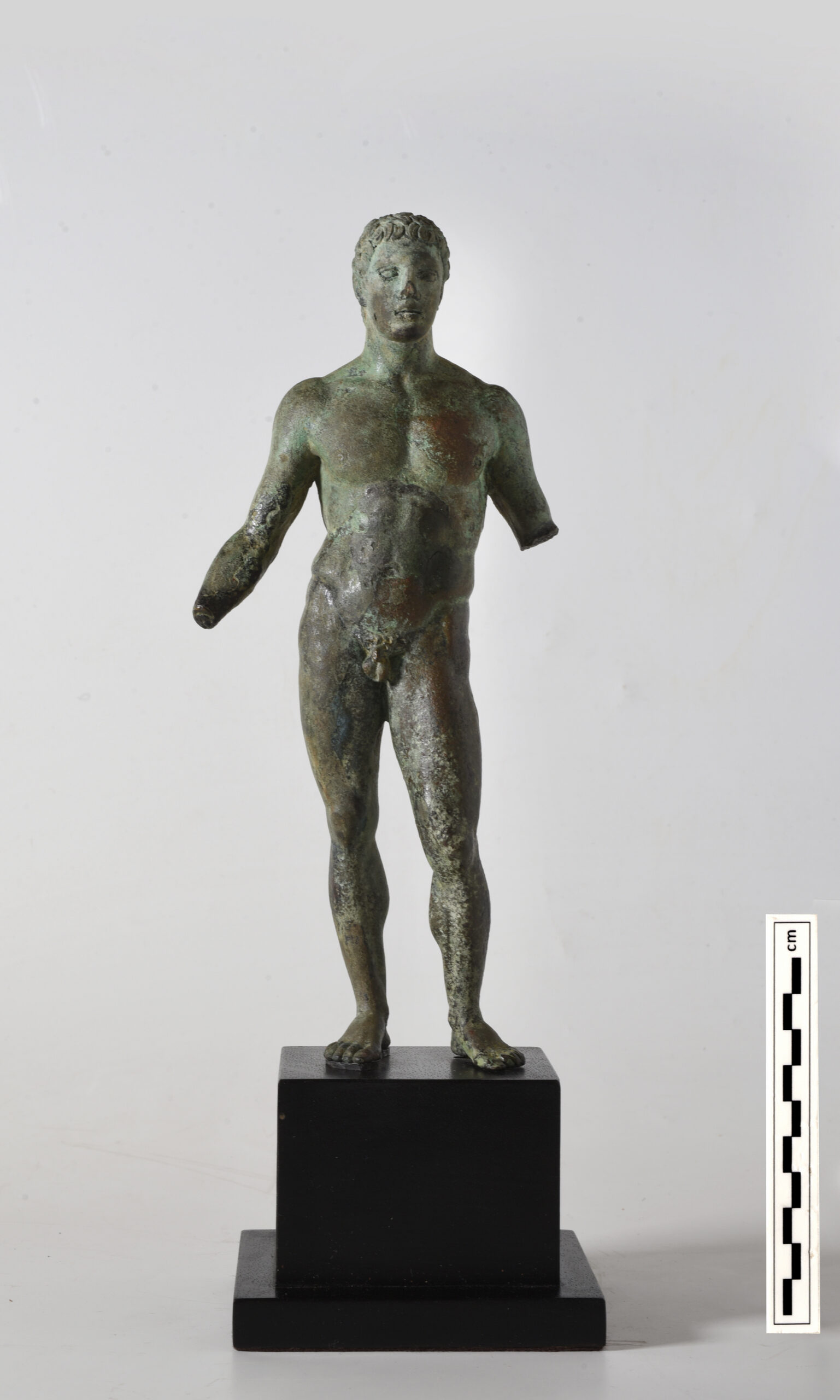 3.Χάλκινο αγαλμάτιο γυμνού νεαρού άνδρα, πιθανόν αθλητή, ύψους 0,24μ. Ο άνδρας παριστάνεται όρθιος, κατενώπιον. Πατά σταθερά στο έδαφος με το δεξί σκέλος. Τα κοντά μαλλιά, ταιριαστά σε αθλητή, αναλύονται σε ακατάστατους βοστρύχους. Θα μπορούσε να χρονολογηθεί στα τέλη του 2ου αι. π.Χ.