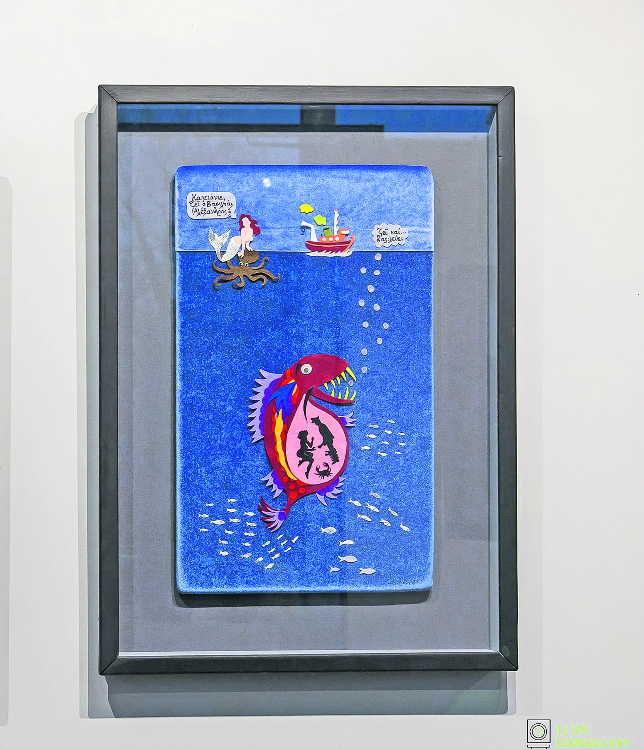 «Είναι αυτοβιογραφικά τα έργα μου σε μεγάλο βαθμό», λέει ο ίδιος στον «Ε.Τ.» και μας εξηγεί πως το ψάρι που πρωταγωνιστεί σε πολλά από τα έργα του είναι αυτό που θα έτρωγαν μια μέρα μαζί με τη γυναίκα του, το οποίο του έδωσε το έναυσμα για να δημιουργήσει μια σειρά από σχέδια που στη συνέχεια έγιναν έργα «για ένα ψάρι που αντί να το φάμε, μας έφαγε τελικά εμένα και τη γυναίκα μου». Eτσι στο έργο «Μεγάλο σκουμπρί» ή «Ο Capten και η Βάγια εν τη κοιλία του κήτους» (η Βάγια είναι η γυναίκα του), η αυτοβιογραφία συναντά τη φαντασία σε έναν υποθαλάσσιο κόσμο, όπου το ζευγάρι πρωταγωνιστεί σε ερωτικές και σατιρικές αφηγήσεις, με έντονες αναφορές στη ναυτική ταυτότητα του καλλιτέχνη.