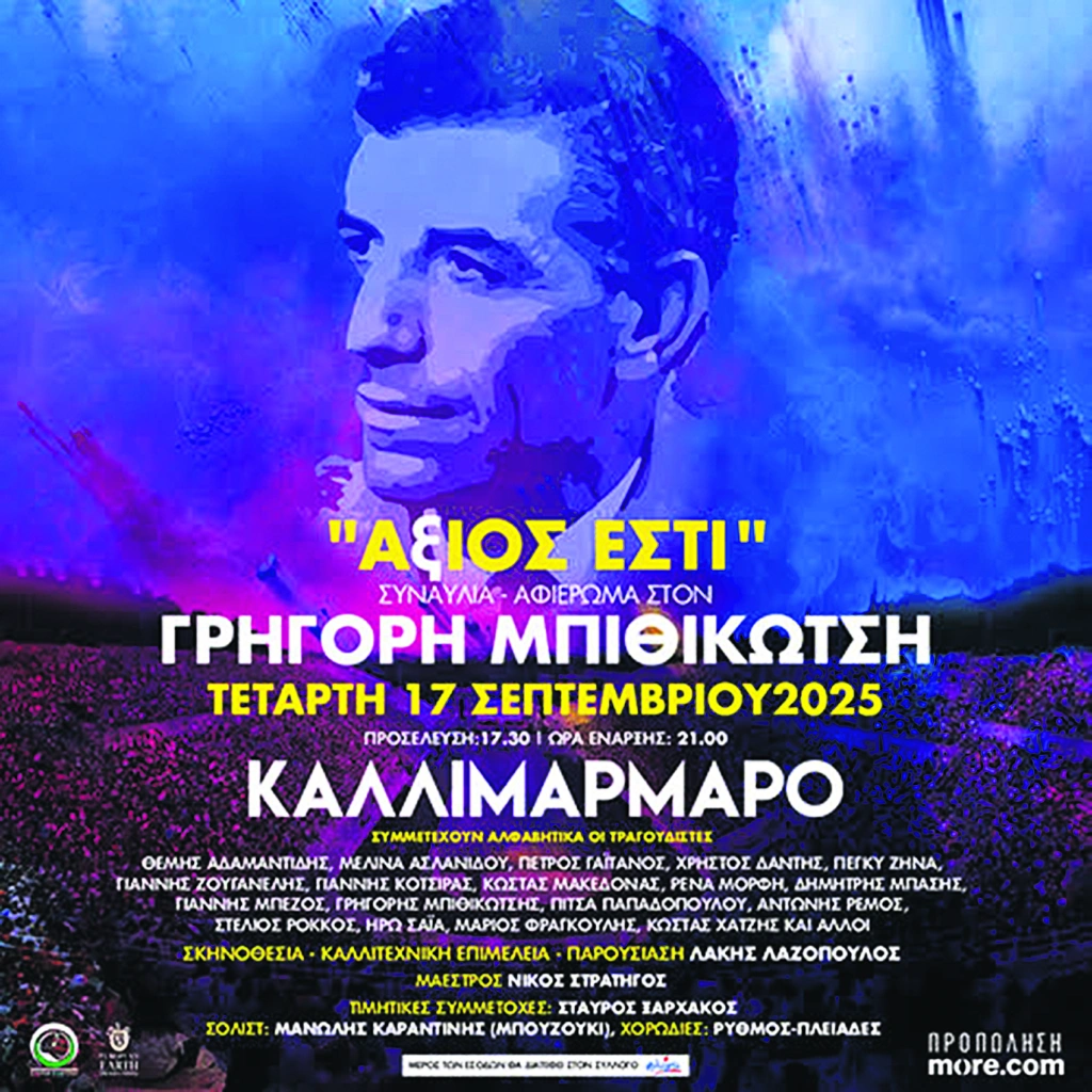 «Αξιος Εστί», συναυλία-αφιέρωμα στον Γρηγόρη Μπιθικώτση. Τετάρτη 17 Σεπτεμβρίου 2025. Ωρα έναρξης: 21:00. Καλλιμάρμαρο Παναθηναϊκό Στάδιο. Εισιτήρια: more.com