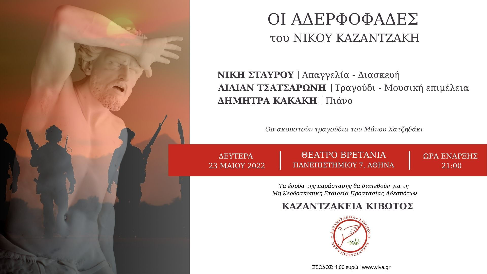 Η μουσικολογοτεχνική βραδιά μνήμης και τιμής, με επίκεντρο το συνταρακτικό αυτό μυθιστόρημα του Νίκου Καζαντζάκη διοργανώνεται την Δευτέρα 23 Μαΐου, στις 9:00 μ.μ., στο Θέατρο Βρετάνια από την Καζαντζάκεια Κιβωτό.