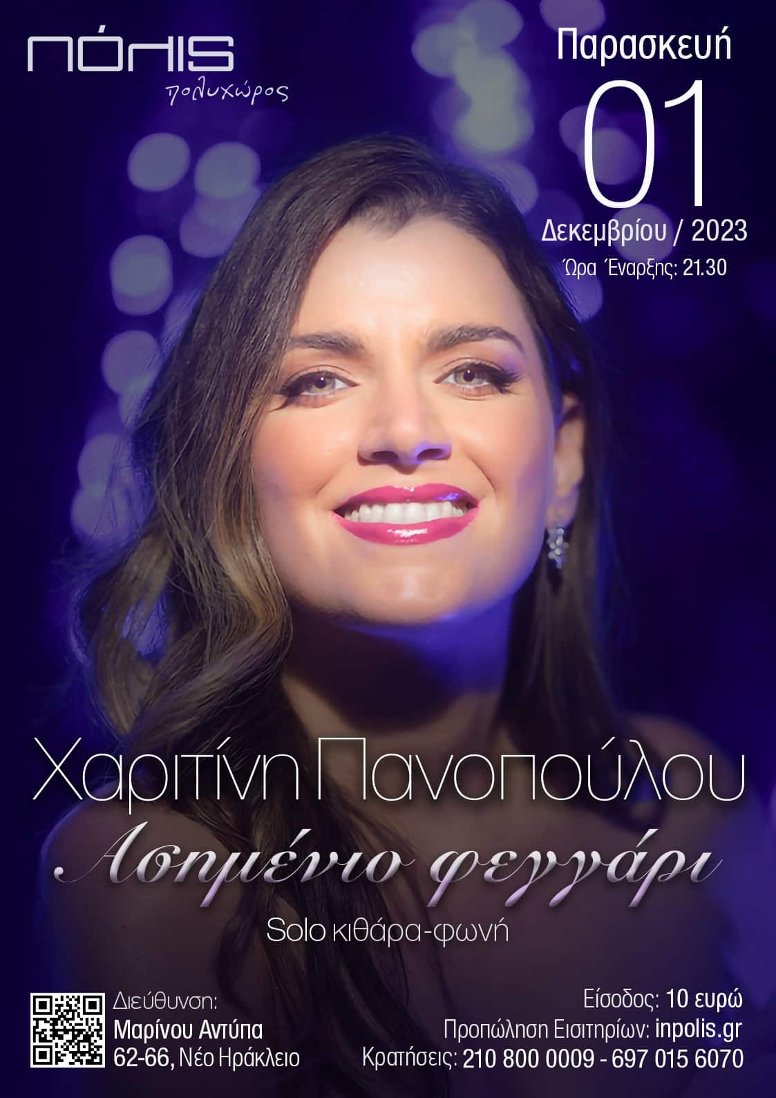 Με αφορμή την κυκλοφορία του νέου της τραγουδιού “Ασημένιο φεγγάρι”, η Χαριτίνη θα μας ταξιδέψει με γνωστά ελληνικά και ξένα τραγούδια από την έντεχνη – ροκ – folk μουσική σκηνή στα πιο όμορφα συναισθήματα με τον γλυκό αλλά και δυναμικό ήχο τόσο της φωνής της, όσο και της κλασικής της κιθάρας.