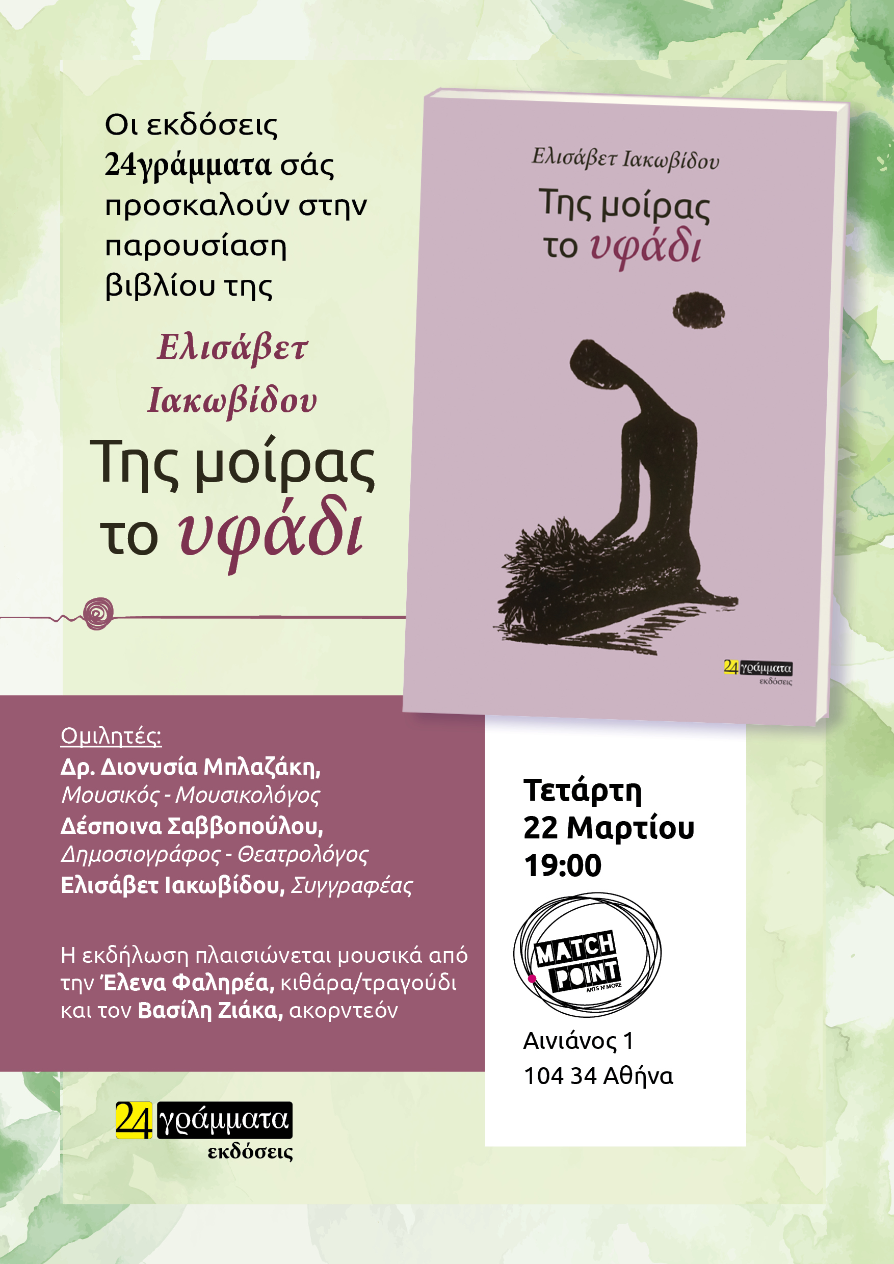Το βιβλίο παρουσιάζεται στις 22 Μαρτίου στις 19:00 στο καφέ Match Point στην οδό Αινιάνος 1 (πλατεία Βικτωρίας).