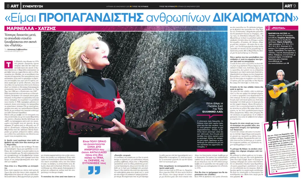 Σε άλλη συνέντευξη που είχε δώσει στον «Ε.Τ.», τον Νοέμβριο του 2009, μαζί με τη Νατάσα Θεοδωρίδου, λίγο πριν από τις κοινές εμφανίσεις τους στον «Βοτανικό», η Μαρινέλλα μάς είχε πει: