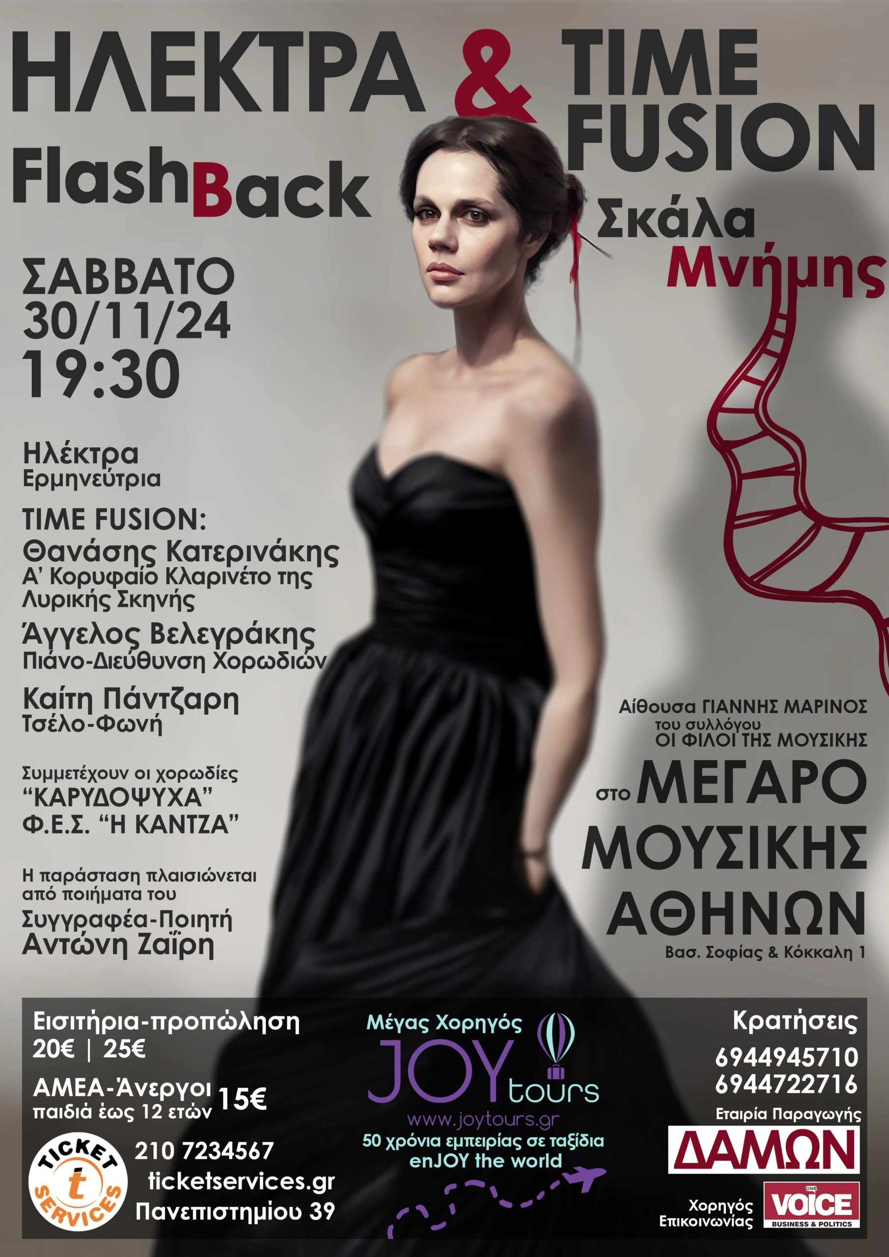 Η παράσταση περιλαμβάνει μεγάλες επιτυχίες των τελευταίων επτά δεκαετιών, της εγχώριας και της διεθνούς μουσικής σκηνής, κλασικά οργανικά κομμάτια, καθώς και ποιήματα του συγγραφέα-ποιητή Αντώνη Ζαΐρη από τη συλλογή του “Σκάλα Μνήμης”. Με την ερμηνεύτρια Ηλέκτρα συμπράττει το μουσικό σύνολο ‘TIME FUSION’, το οποίο απαρτίζεται από τους